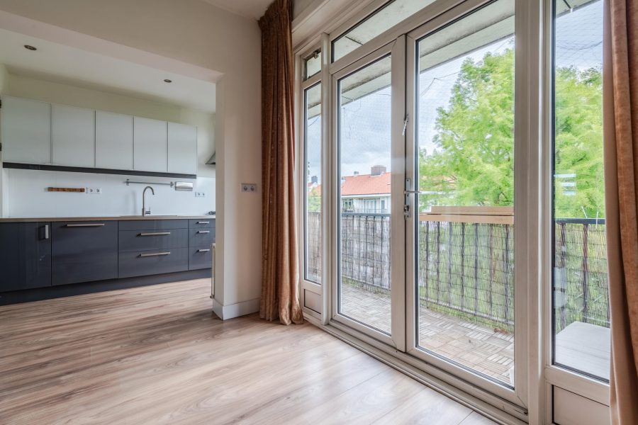 • Woonkamer met open keuken en openslaande deuren naar het balkon aan de achterzijde en toegangsdeur naar het balkon aan de voorzijde