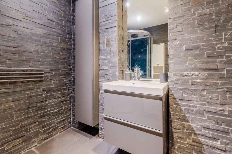 Spacious entrance with the floating toilet immediately to your right and access to two bedrooms. The largest bedroom has fitted wardrobes and access to the balcony at the front. You have unobstructed views here. Central on the floor is the contemporary bathroom. The bathroom has a vanity unit with mirror, a design radiator, a high storage cupboard and luxury shower cabin. The bathroom has recessed spotlights. On your left you will find the third bedroom and at the end of the hallway the deep, bright living room with open kitchen.