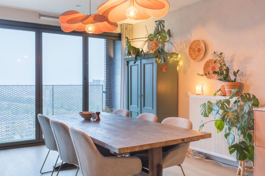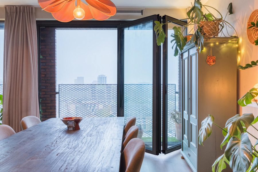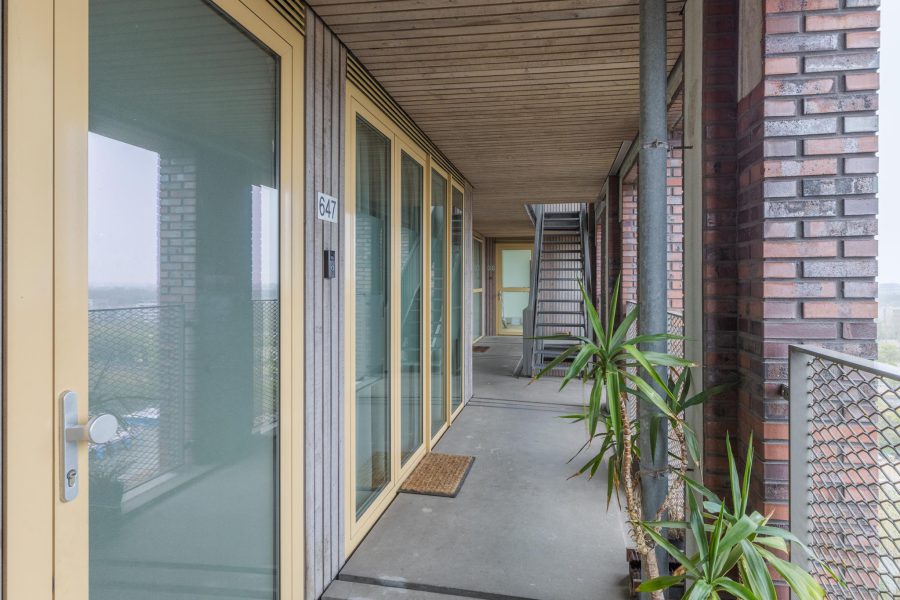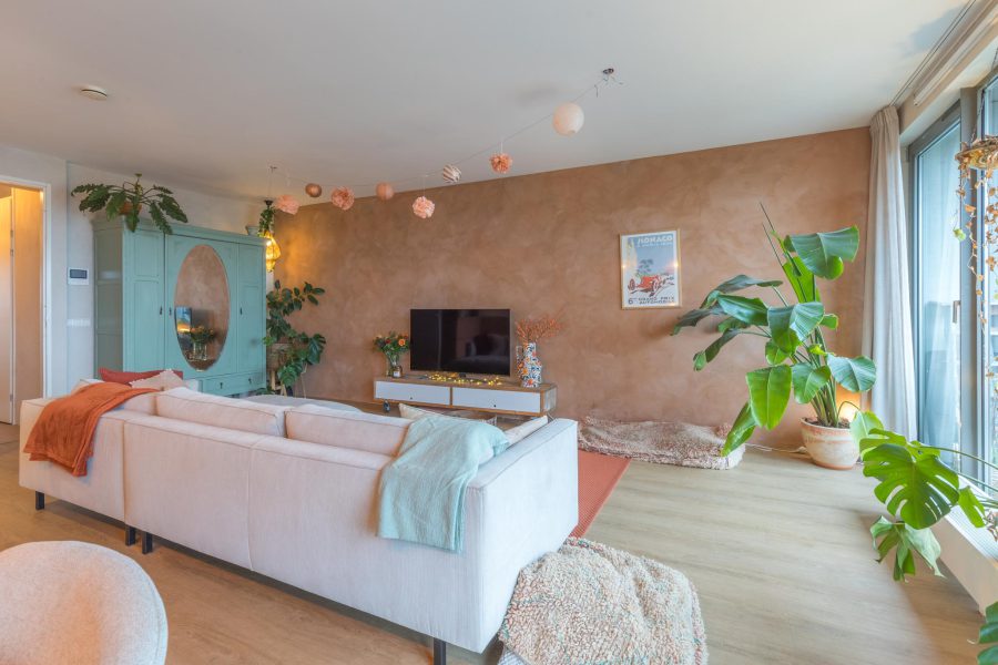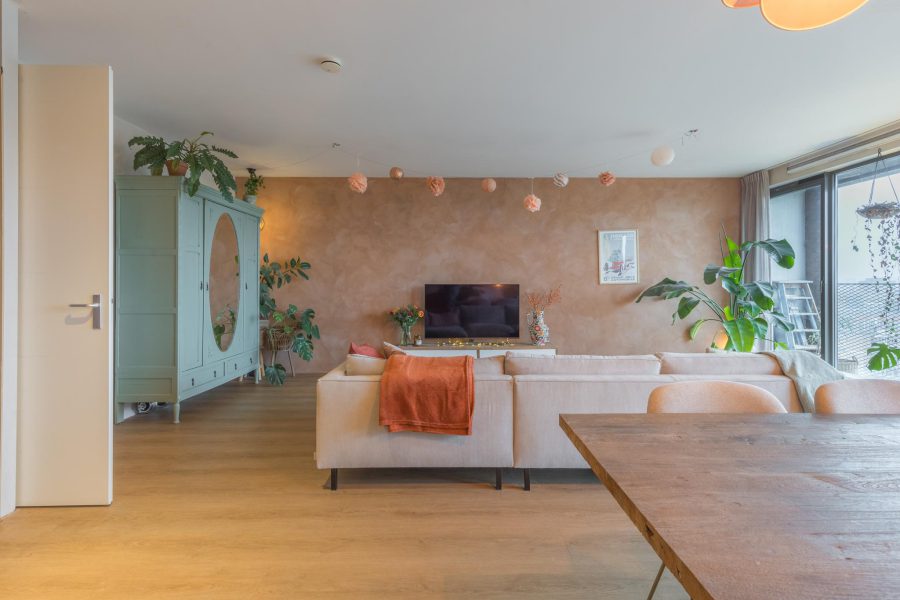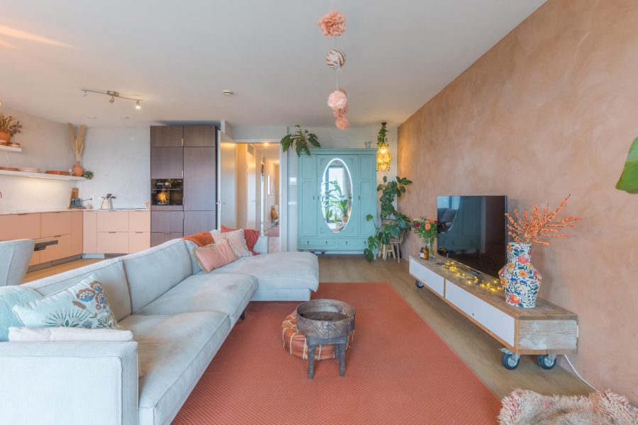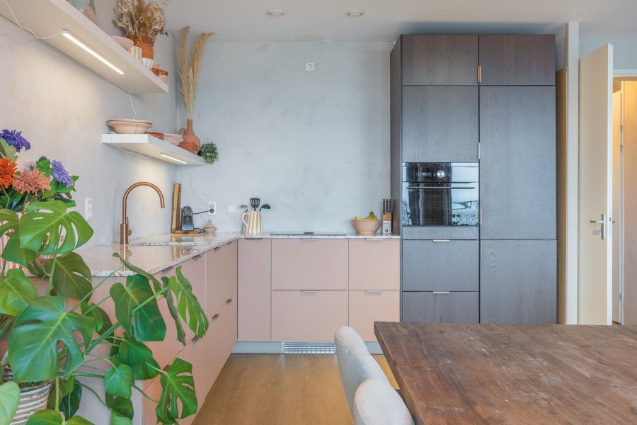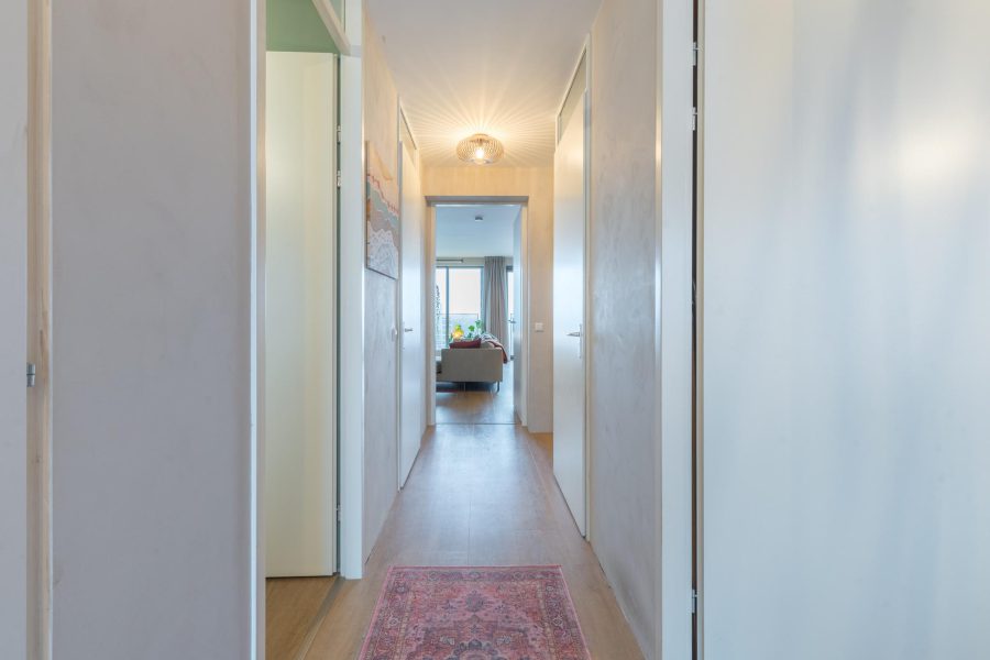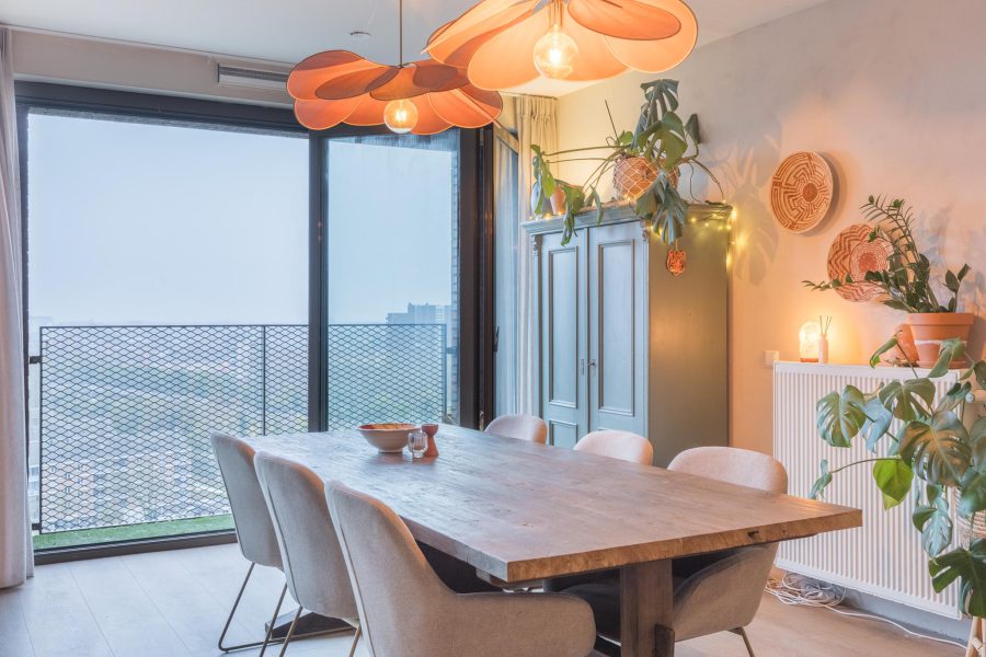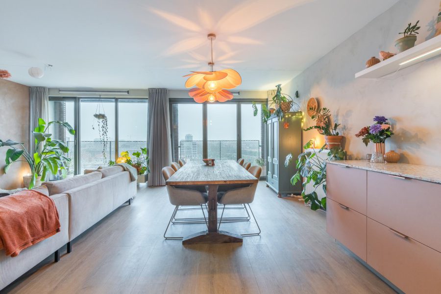 The lift takes us to the 14th floor and the front door of the apartment. Entrance with storage closet and directly on your left and right you will find a bedroom. The largest bedroom has a closet. The bedrooms have high windows and a nice light. Further down the hallway, you will find the separate floating toilet and the bathroom. The spacious bathroom has a vanity unit with sink and mirror and a shower. Opposite the bathroom you will find a storage room with the connection for washer and dryer. At the end of the hallway is access to the spacious, bright living room with open kitchen. The cosy living room has high windows at the front with three inward-swinging doors to a narrow balcony. Here you have beautiful views of the surrounding area. At the back of the living room you will find the beautiful L-shaped kitchen. The kitchen (2024) has salmon pink and walnut wooden fronts and a natural stone counter top. The kitchen is equipped with various modern built-in appliances. You cook electric here and you have an extractor in the slab. On the floor of the entire apartment is a PVC laminate floor and the ceilings and walls are finished sleekly and sometimes decoratively. The living room has enough space for a spacious seating area and a large dining table for socialising with friends and family.