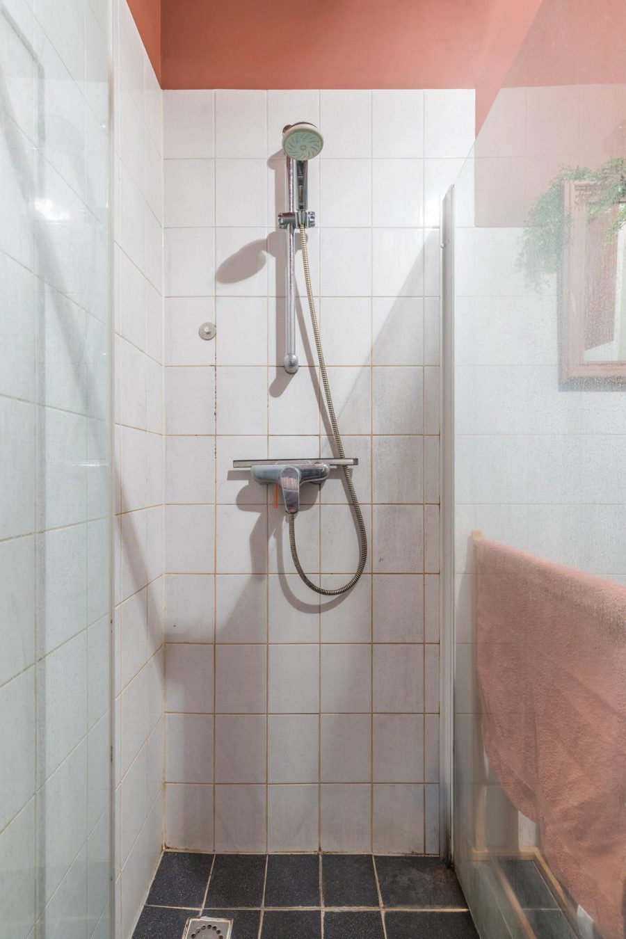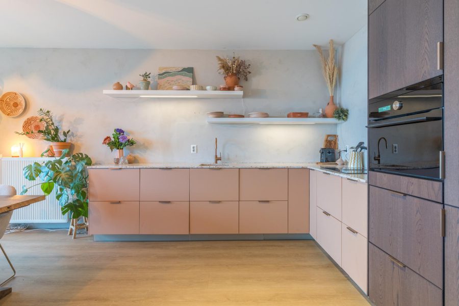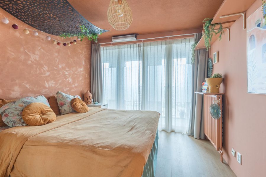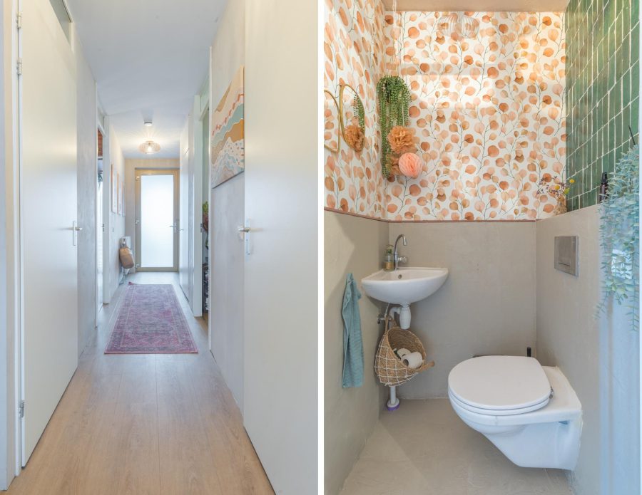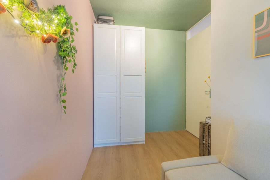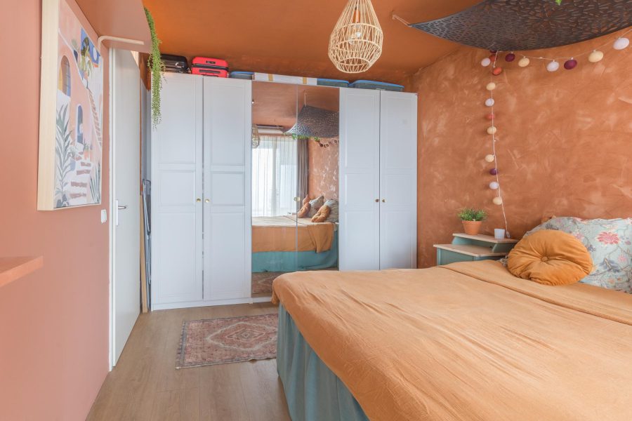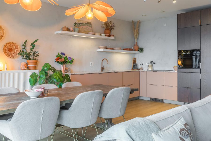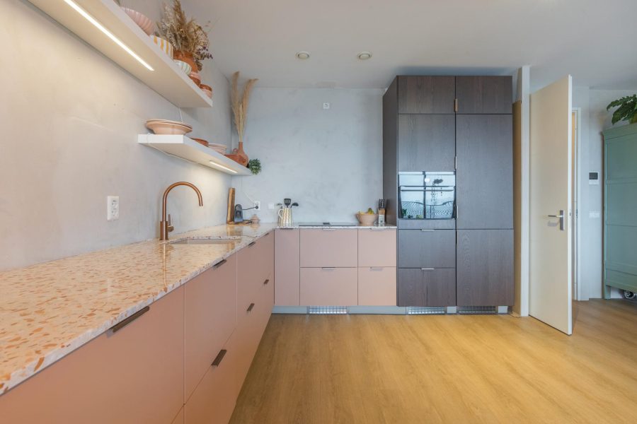 The lift takes us to the 14th floor and the front door of the apartment. Entrance with storage closet and directly on your left and right you will find a bedroom. The largest bedroom has a closet. The bedrooms have high windows and a nice light. Further down the hallway, you will find the separate floating toilet and the bathroom. The spacious bathroom has a vanity unit with sink and mirror and a shower. Opposite the bathroom you will find a storage room with the connection for washer and dryer. At the end of the hallway is access to the spacious, bright living room with open kitchen. The cosy living room has high windows at the front with three inward-swinging doors to a narrow balcony. Here you have beautiful views of the surrounding area. At the back of the living room you will find the beautiful L-shaped kitchen. The kitchen (2024) has salmon pink and walnut wooden fronts and a natural stone counter top. The kitchen is equipped with various modern built-in appliances. You cook electric here and you have an extractor in the slab. On the floor of the entire apartment is a PVC laminate floor and the ceilings and walls are finished sleekly and sometimes decoratively. The living room has enough space for a spacious seating area and a large dining table for socialising with friends and family.