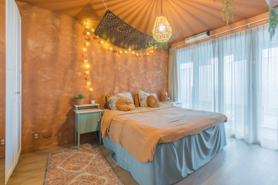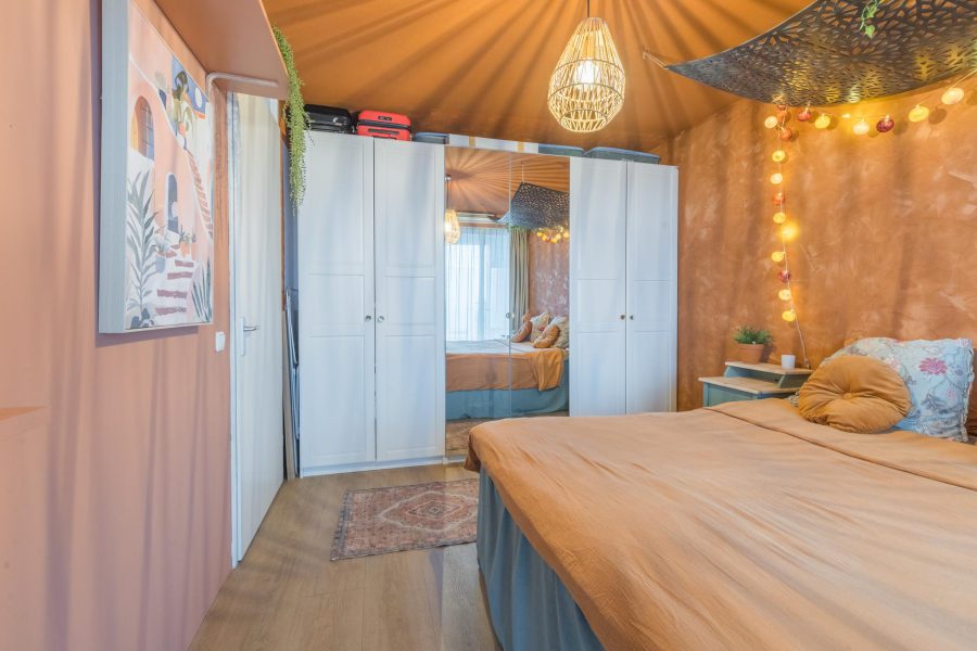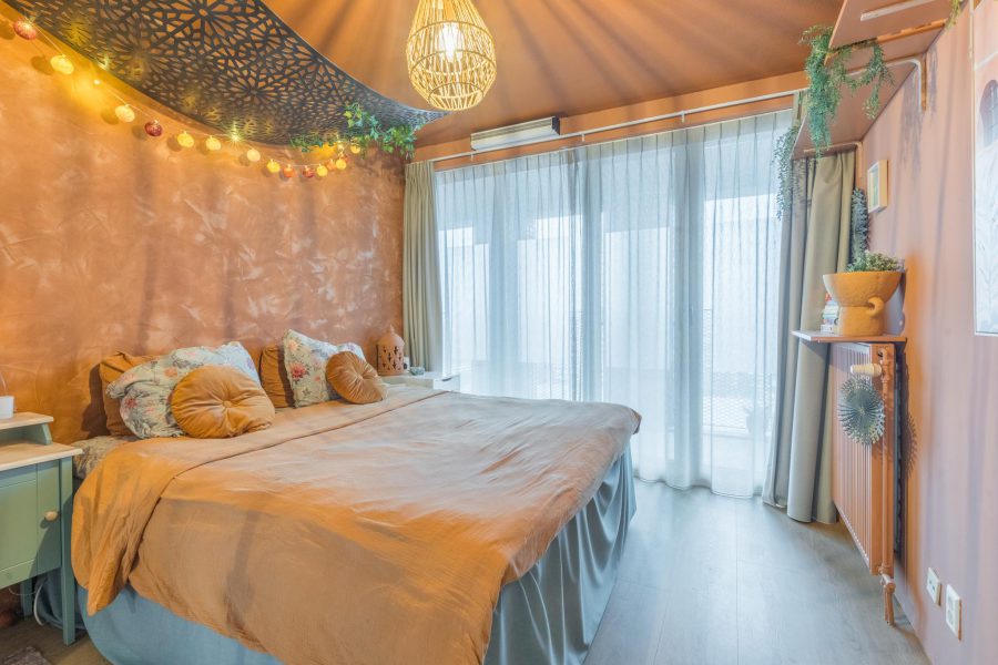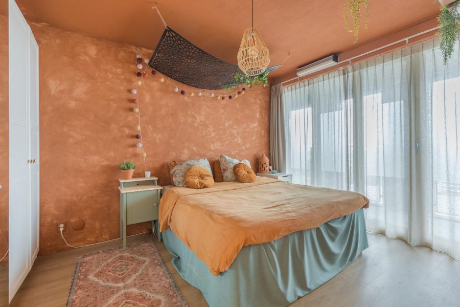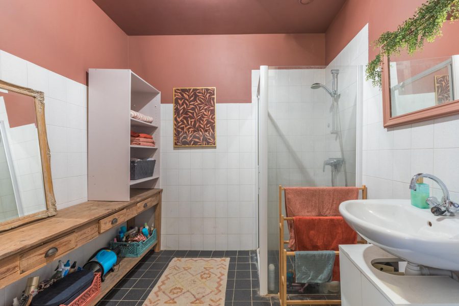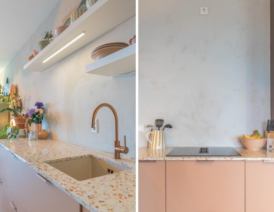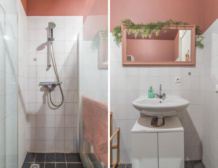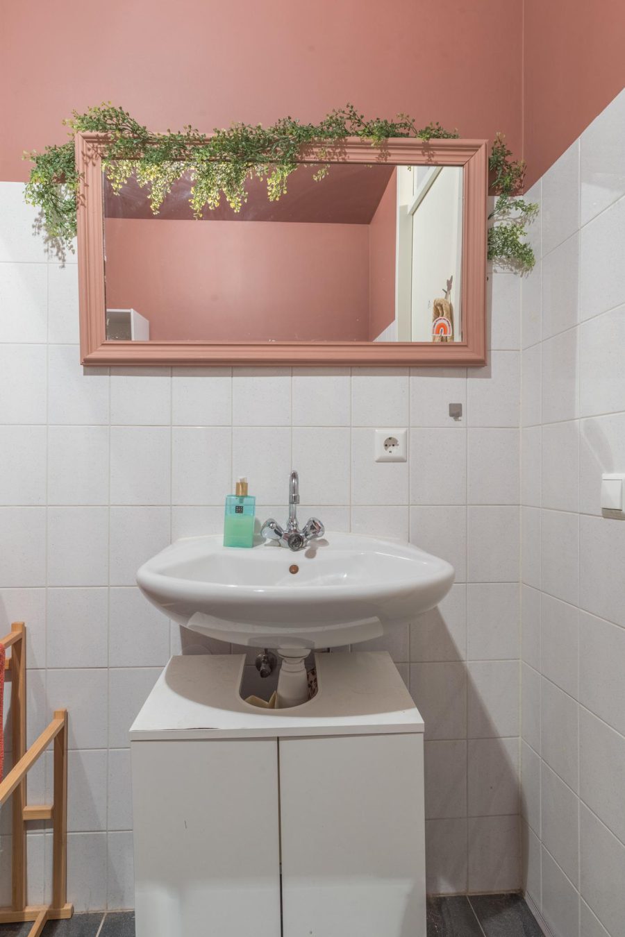 The lift takes us to the 14th floor and the front door of the apartment. Entrance with storage closet and directly on your left and right you will find a bedroom. The largest bedroom has a closet. The bedrooms have high windows and a nice light. Further down the hallway, you will find the separate floating toilet and the bathroom. The spacious bathroom has a vanity unit with sink and mirror and a shower. Opposite the bathroom you will find a storage room with the connection for washer and dryer. At the end of the hallway is access to the spacious, bright living room with open kitchen. The cosy living room has high windows at the front with three inward-swinging doors to a narrow balcony. Here you have beautiful views of the surrounding area. At the back of the living room you will find the beautiful L-shaped kitchen. The kitchen (2024) has salmon pink and walnut wooden fronts and a natural stone counter top. The kitchen is equipped with various modern built-in appliances. You cook electric here and you have an extractor in the slab. On the floor of the entire apartment is a PVC laminate floor and the ceilings and walls are finished sleekly and sometimes decoratively. The living room has enough space for a spacious seating area and a large dining table for socialising with friends and family.