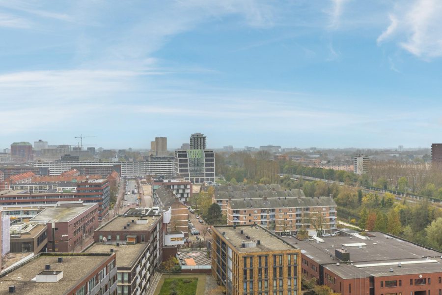 De lift brengt ons naar de 14e verdieping en de voordeur van de woning. Entree met bergkast en direct aan je linker- en rechterhand tref je een slaapkamer aan. De grootste slaapkamer is voorzien van een vaste kast. De slaapkamers hebben hoge raampartijen en een mooie lichtinval. Verderop in de gang vind je het separate zwevende toilet en de badkamer. De ruime badkamer is voorzien van een badmeubel met wastafel en spiegel en een douche. Tegenover de badkamer tref je een berging aan met de aansluiting voor het witgoed. Aan het eind van de gang is de toegang tot de ruime, lichte woonkamer met open keuken. De sfeervolle woonkamer heeft aan de voorzijde hoge raampartijen met drie naar binnen draaiende deuren naar een smal balkon. Je hebt hier een prachtig uitzicht over de omgeving. Achterin de woonkamer tref je de fraaie L-vormige keuken aan. De keuken (2024) heeft zalmroze en noten houten fronten en een natuurstenen aanrechtblad. De keuken is voorzien van diverse moderne inbouwapparatuur. Je kookt hier elektrisch en je hebt een afzuiging in de plaat. Op de grond van het gehele appartement ligt een pvc-laminaatvloer en de plafonds en muren zijn strak en soms decoratief afgewerkt. In de woonkamer is plaats genoeg voor een ruime zithoek en een grote eettafel om gezellig met vrienden en familie te eten.