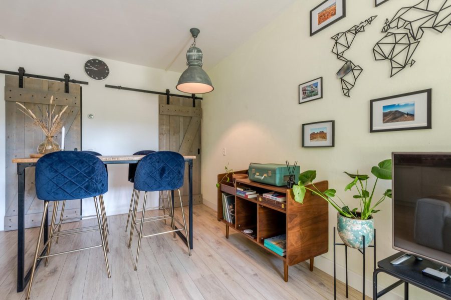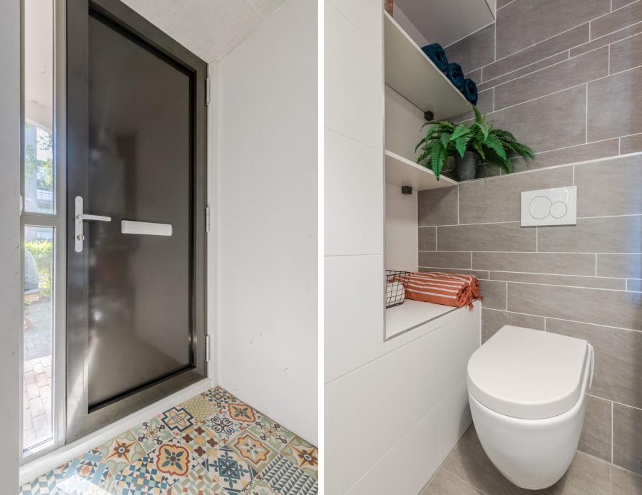Achterin de woonkamer tref je twee fraaie houten loftdeuren aan. Eén geeft toegang tot de slaapkamer met vaste spiegelkast. Hier is ruimte voor een royaal tweepersoonsbed. Naast de slaapkamer bevindt zich de ruime badkamer. De moderne badkamer beschikt over een badmeubel met brede wastafel en spiegelkast, een zwevend toilet en een douchecabine met hand- en regendouche. Ook bevindt zich hier een praktische bergkast met de aansluiting voor het witgoed. Op de vloer van de entree liggen stijlvolle Portugese tegels en op de vloer van de woonkamer en slaapkamer ligt laminaat.