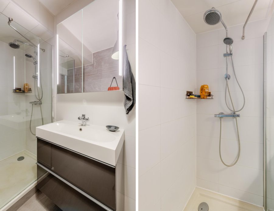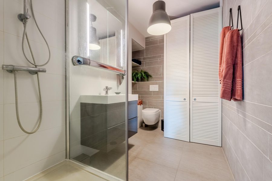 • Moderne badkamer met inbouwkast voor wasmachine en droger