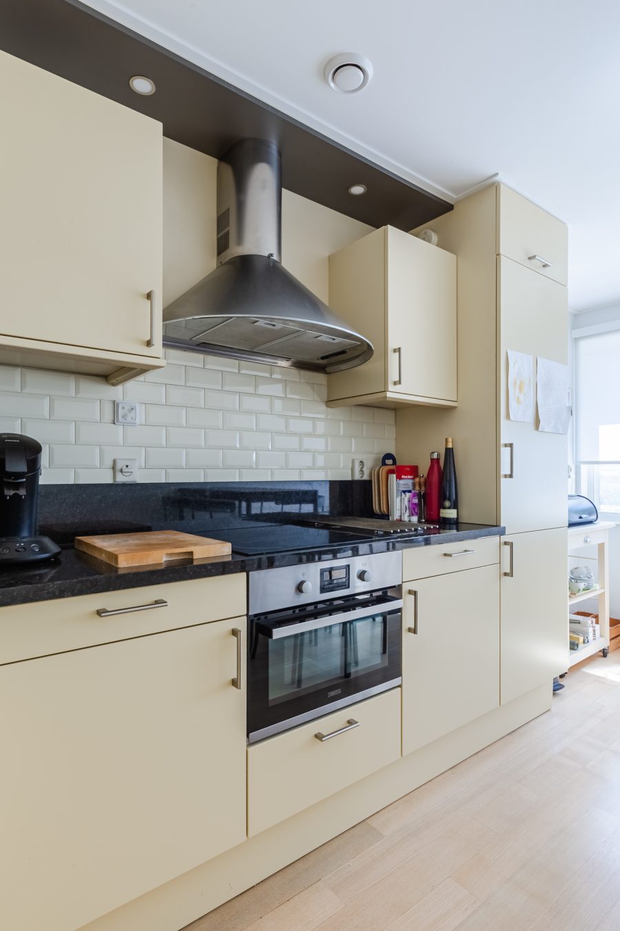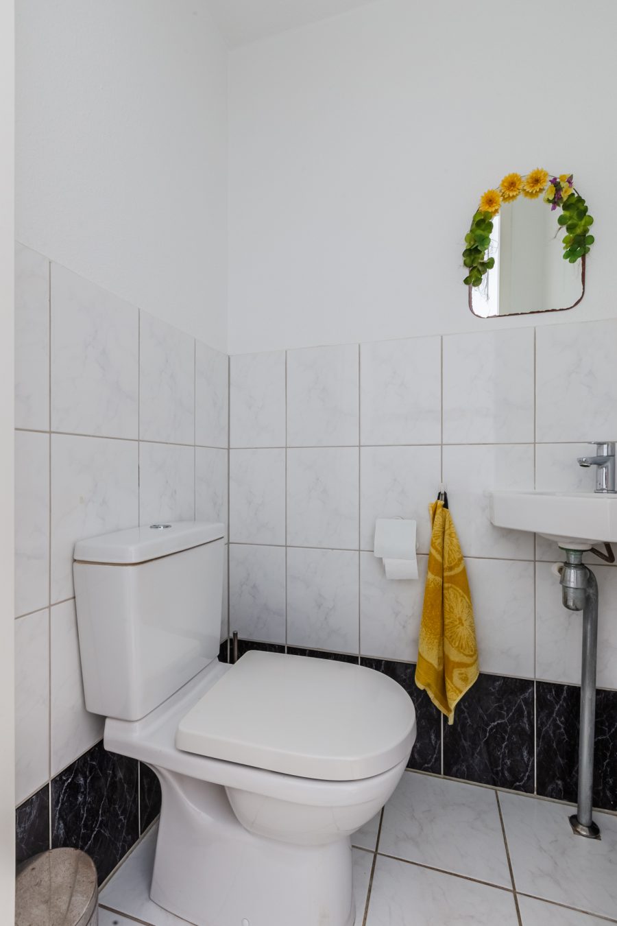Via the pavement in the quiet street, we reach the front door of the house. Entrance with wardrobe and meter closet, standing toilet with hand basin, stairs closet, staircase to the first floor and access to the garden-oriented living room with open access to the kitchen. The bright, extended (2020) living room has a wide, high glass front at the back with French doors to the garden. At the front you will find the open access to the kitchen. The kitchen has vanilla fronts and a dark countertop. The kitchen (2021) is equipped with various built-in appliances. You cook electric here. The kitchen is large enough to fit a breakfast bar/table. On the ground floor is a nice laminate floor and at the back of the living room in the extended area are tiles with underfloor heating. The walls and ceilings are finished sleek and neutral.