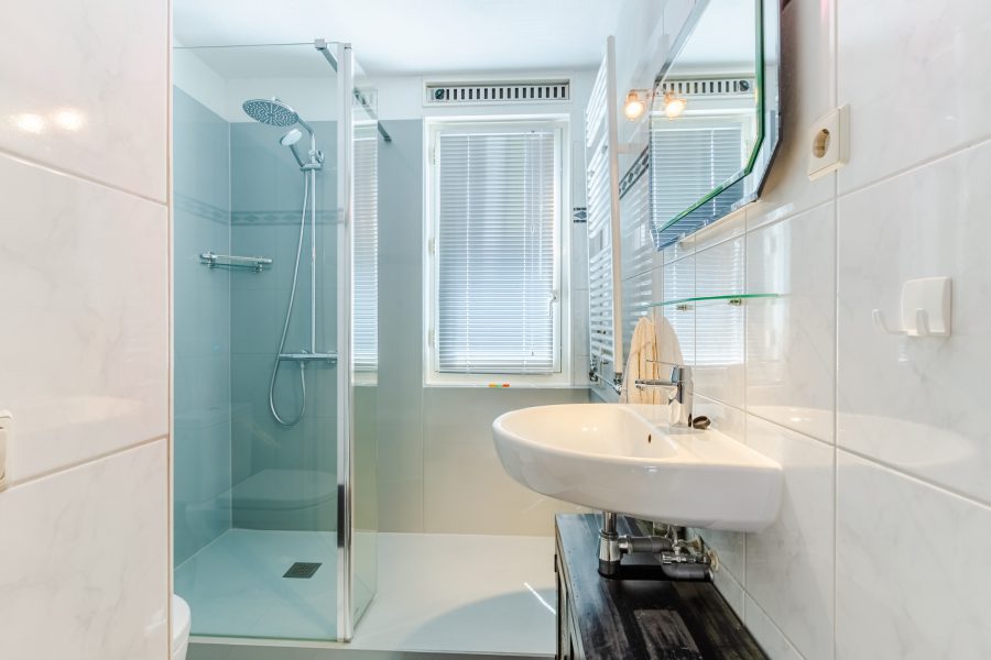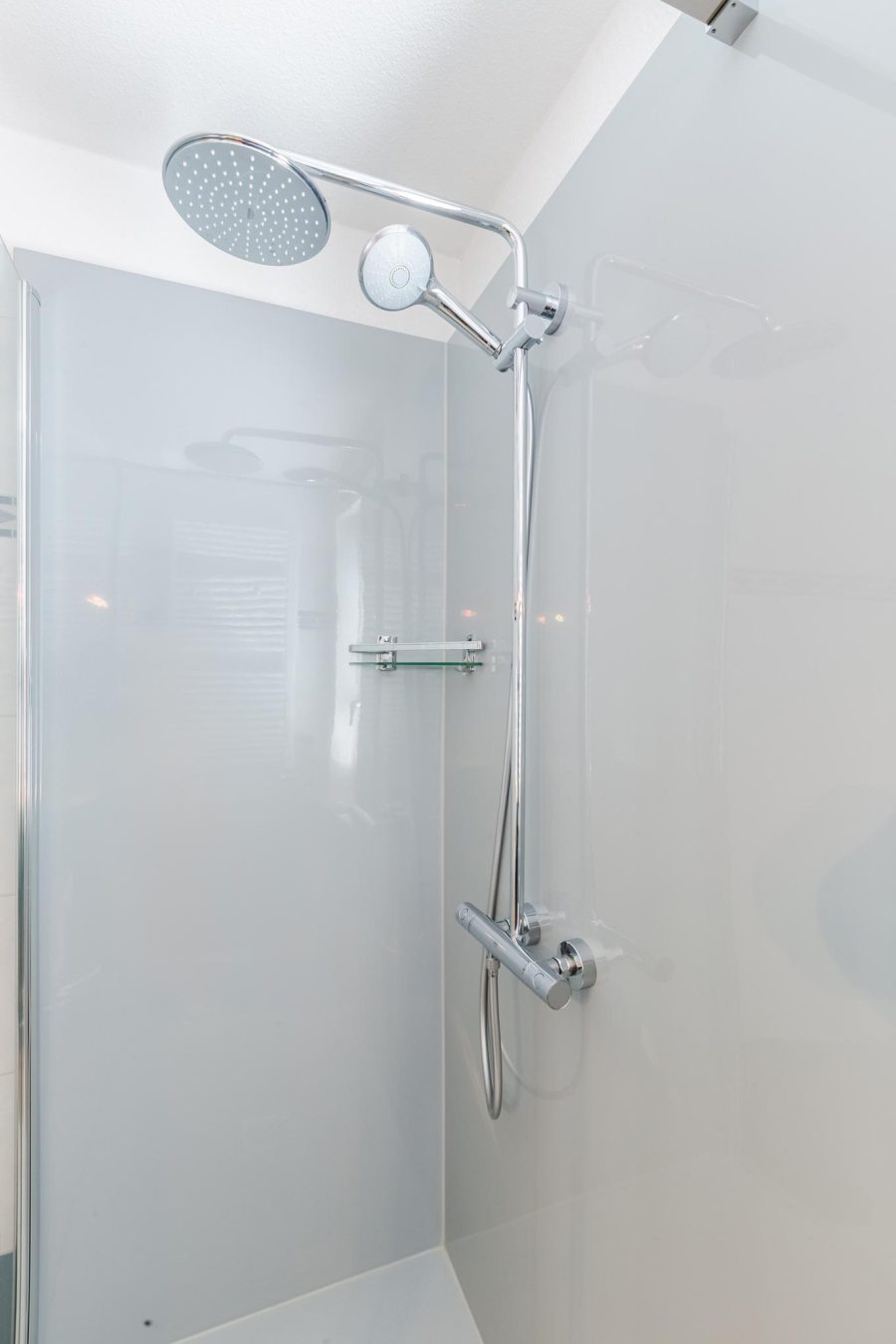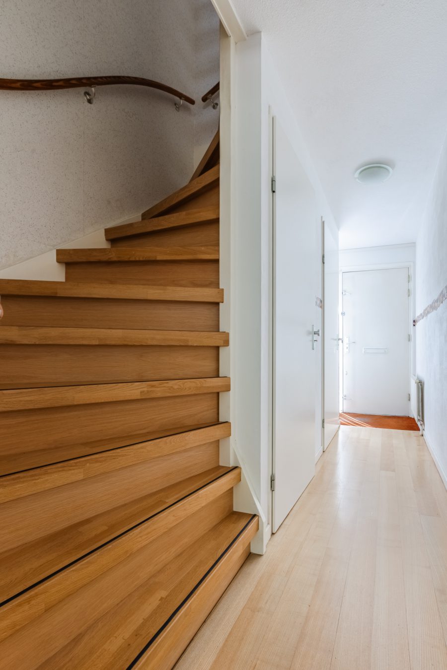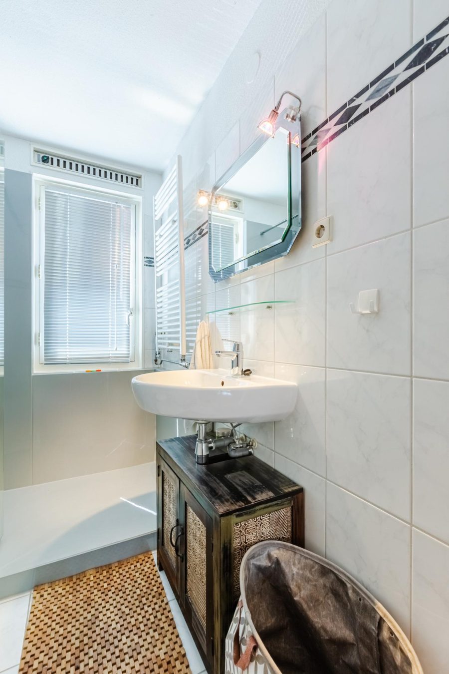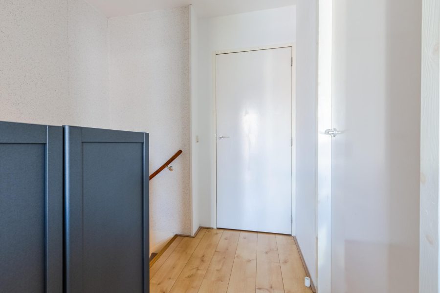 Via the neatly clad staircase we reach the landing of this floor. Here we find two bedrooms and the bathroom. The master bedroom is at the rear and the second bedroom is at the front, next to the bathroom. Both bedrooms are nicely finished and there is enough space for a workstation. In the bathroom, you will find a vanity unit with sink and mirror, a floating toilet and a wide walk-in shower with hand and rain shower.
