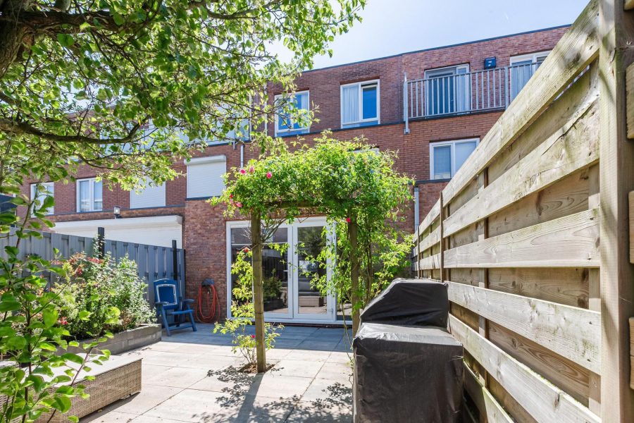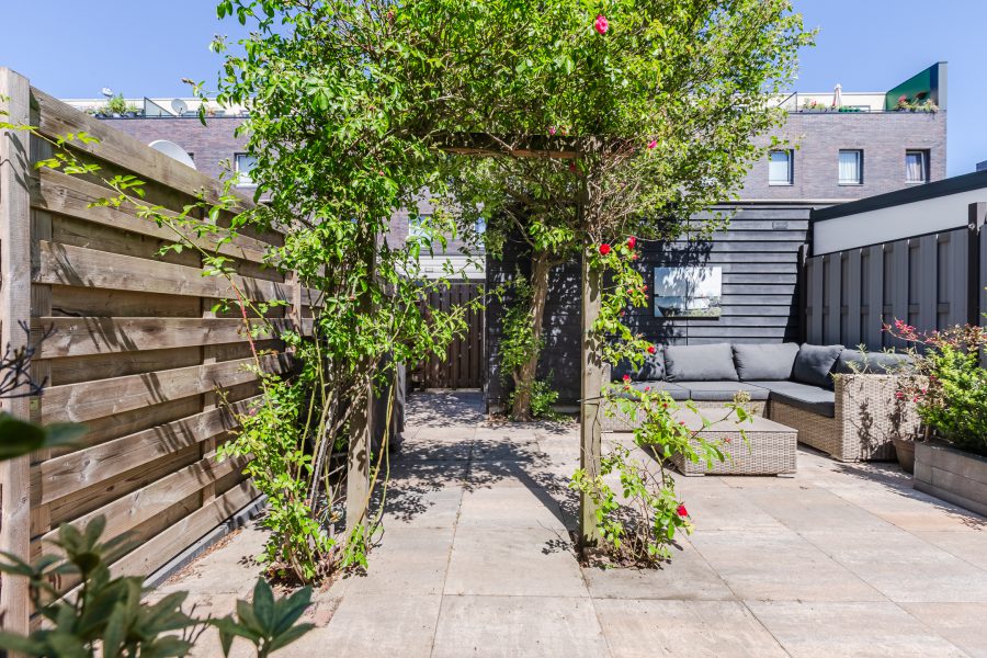 De woning heeft een zonnige, betegelde en beschutte achtertuin. Je treft hier ook groene accenten aan. Je vindt er een boom, een pergola en een bloembak met vaste planten. Je kunt hier een fijne loungeplek realiseren en buiten eten in de zomermaanden. De tuin is voorzien van een buitenkraan. Achterin de tuin staat een houten (fietsen)berging met elektra en er is een achterom.