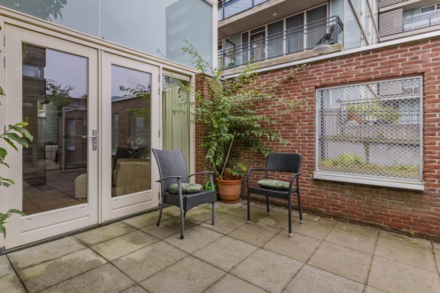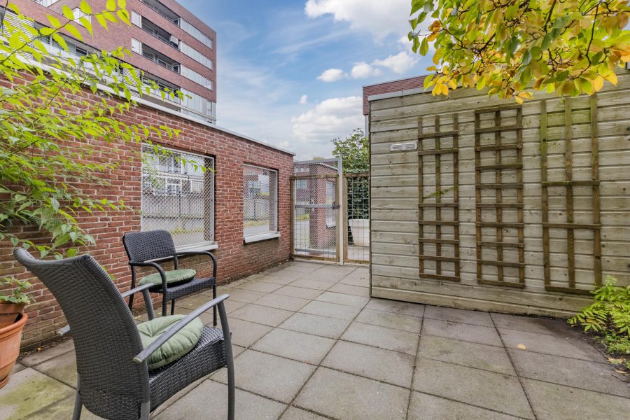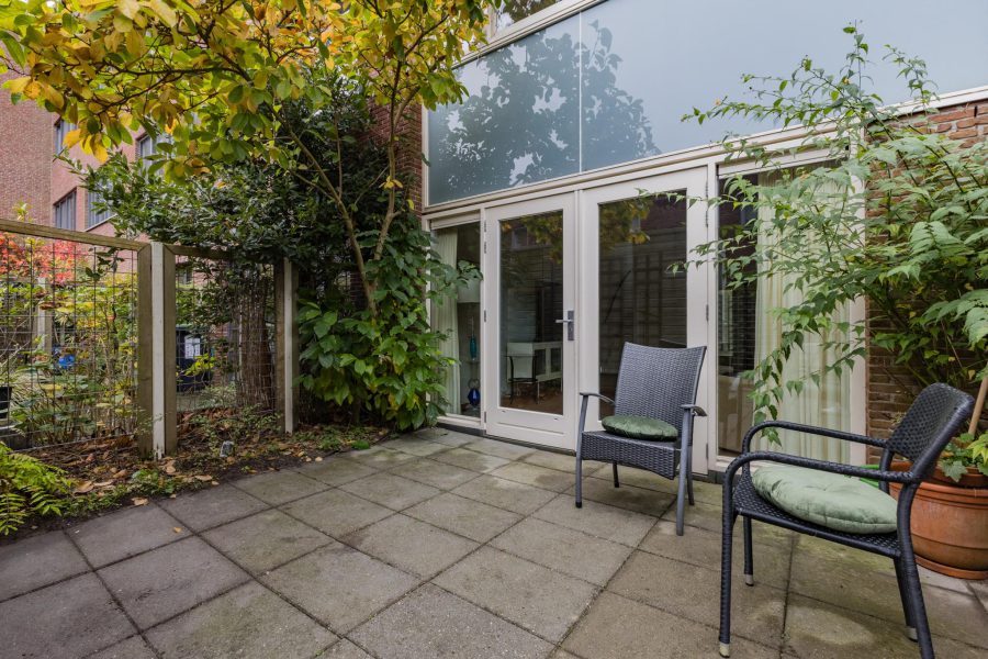 De woonkamer in het souterrain geeft toegang tot een betegelde achtertuin. De tuin heeft groene borders en is groot genoeg om er een fijne loungeplek te realiseren. In de tuin staat een houten berging en er is een achterom.