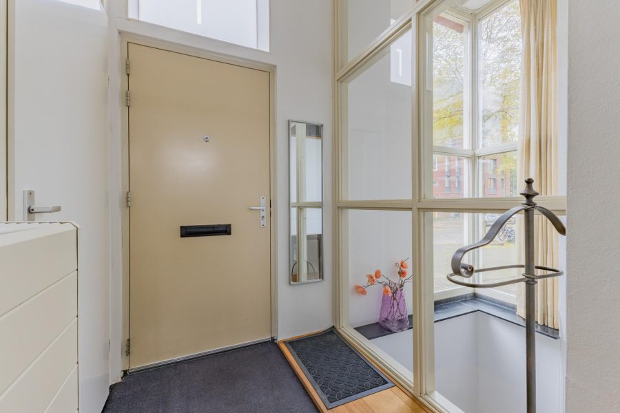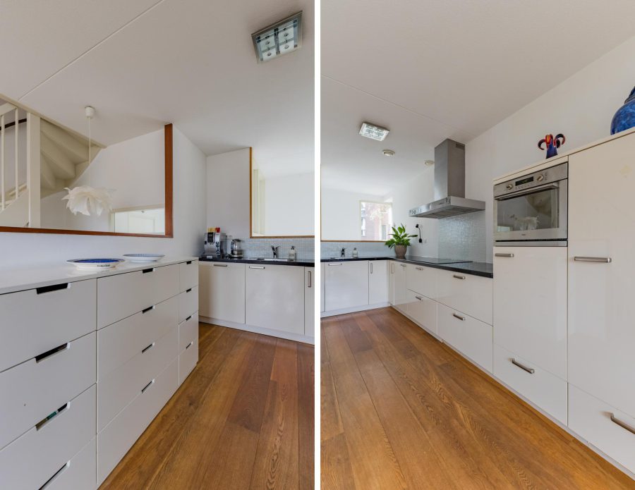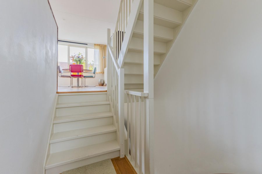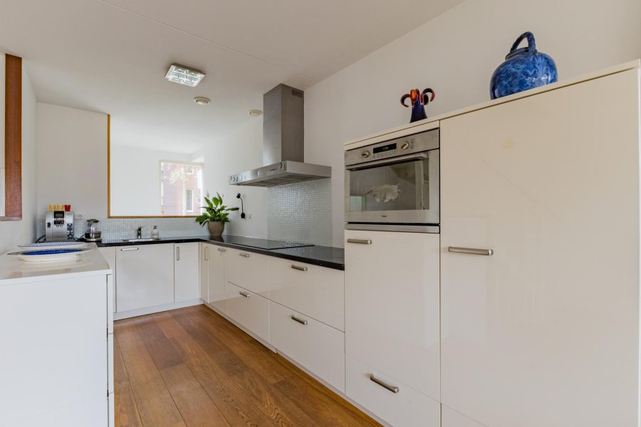 Entrance with cloakroom and meter closet, floating toilet with hand basin, draught door with stairs to lower living floor/souterrain. There is a short staircase in the hall to the living room with open kitchen. The spacious, bright living room has large windows at the rear. The open kitchen is located at the front of the house. The L-shaped kitchen has white fronts and is equipped with built-in appliances. You cook electric here. There are wooden floorboards and the walls and ceilings are finished to a high standard. The staircase to the second floor can be found in the living room.