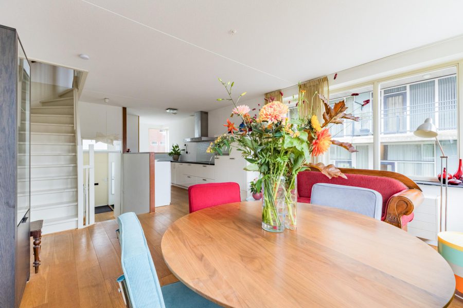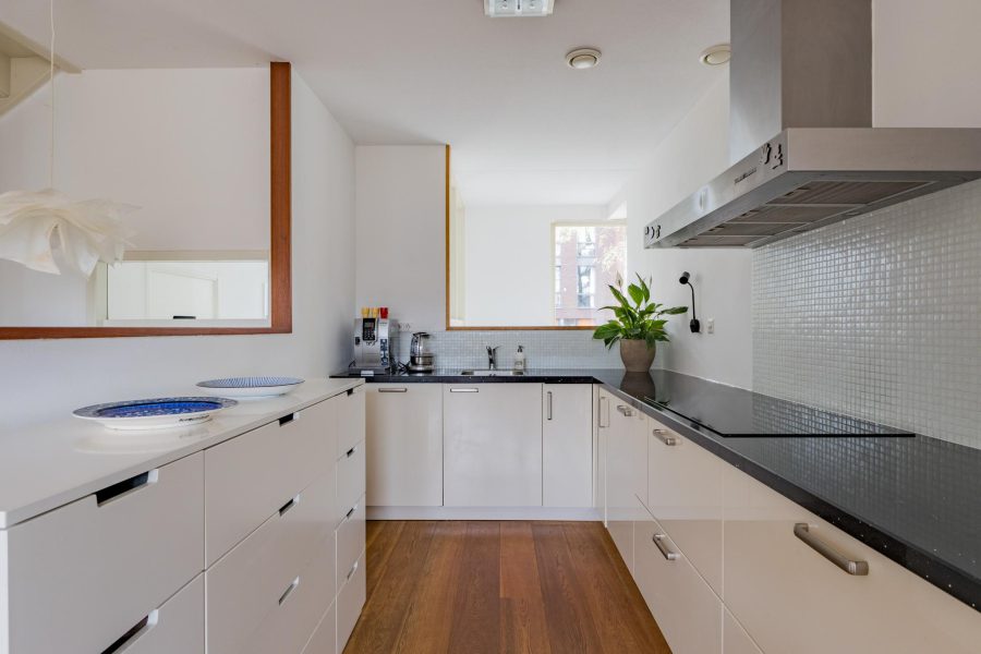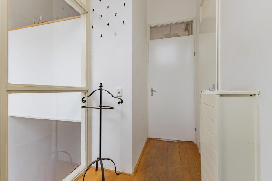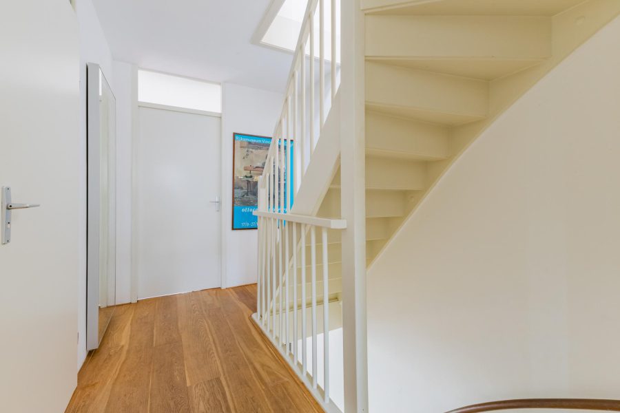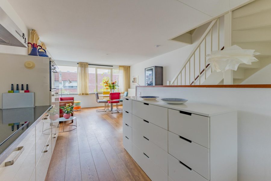 Entree met garderobe en meterkast, zwevend toilet met fonteintje, tochtdeur met trap naar onderste woonlaag/souterrain. Er is in de hal een korte trap naar de woonkamer met open keuken. De ruime, lichte woonkamer heeft aan de achterzijde grote raampartijen. De open keuken ligt aan de voorzijde van de woning. De L-vormige keuken heeft witte fronten en is voorzien van inbouwapparatuur. Je kookt hier elektrisch. Er liggen houten vloerdelen en de muren en plafonds zijn strak afgewerkt. In de woonkamer is de trap naar de tweede verdieping te vinden.