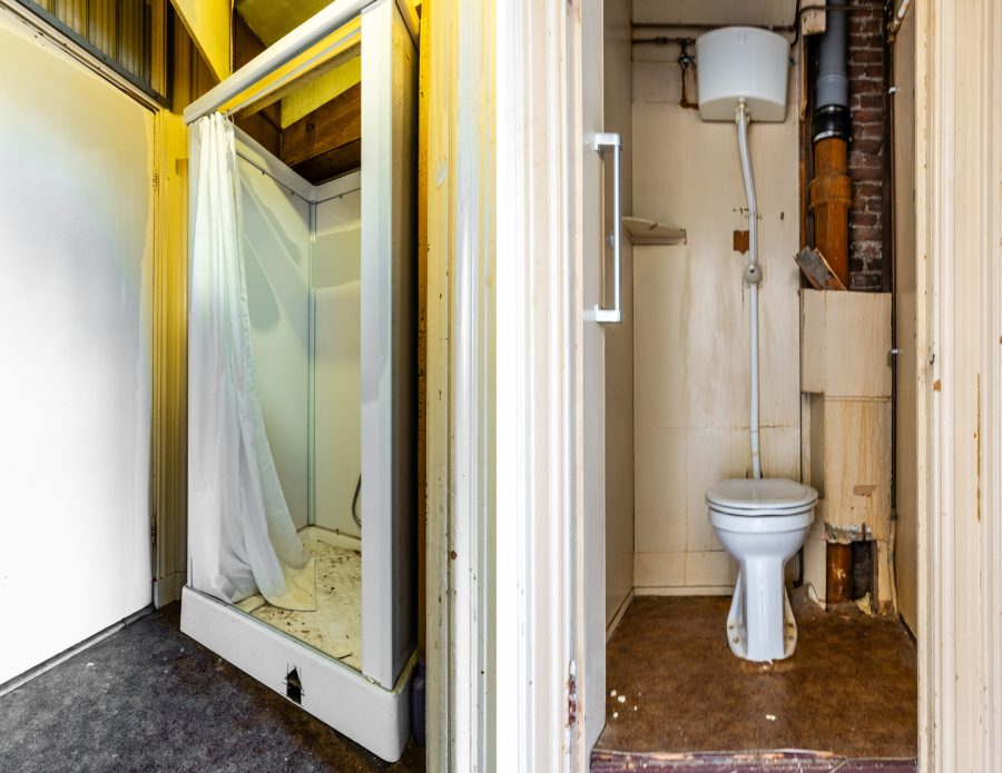 Via de trap bereiken we de voordeur van de woning. Hal met toegang tot de douche, het toilet, de eenvoudige keuken en de toegang tot de woonkamer met open toegang tot de eetkamer die aan de achterzijde van de woning is gelegen. De eetkamer heeft twee raampartijen, een schouw met gaskachel en twee vaste kasten aan weerszijden van de en suite deuren die toegang geven tot de ruime, lichte woonkamer die aan de voorzijde van de verdieping is gelegen. Ook deze kamer is voorzien van een schouw met gashaard.