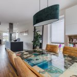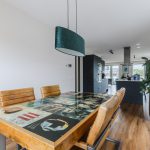 Centrally located in the living room is the modern open kitchen. This beautiful kitchen with a cooking island features a stunning design with dark cabinets and a Topline granite worktop. It is equipped with modern appliances including a dishwasher, induction hob, extractor hood, oven, combination microwave, Quooker (2025), fridge, and freezer. Directly adjacent to the kitchen is the dining area, where there is enough space for a large dining table.