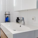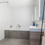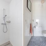 The apartment boasts three bedrooms. These rooms are generously sized and impeccably finished, all enjoying plenty of natural light. The bathroom is neatly finished with grey floor tiles and white wall tiles. Here you will find a vanity unit with a sink, a bathtub, and a walk-in shower. The apartment also has a separate toilet room with a wall-hung toilet and a small sink.
