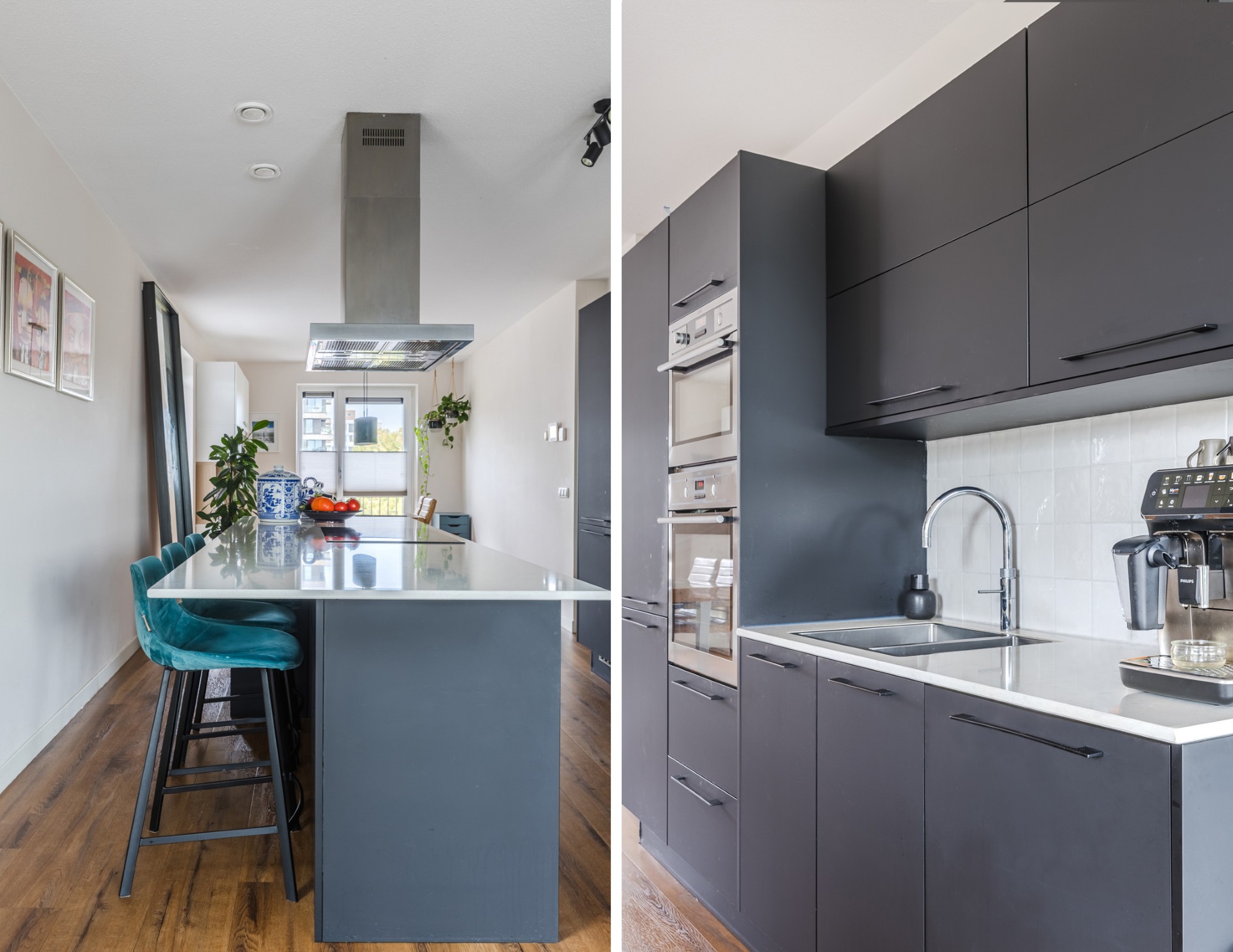 Centraal in de woonkamer bevindt zich de moderne open keuken. Deze fraaie keuken met kookeiland heeft een prachtig design met donkere keukenkastjes en een Topline granieten werkblad. Moderne apparatuur is er in de vorm van een vaatwasser, inductiekookplaat, afzuigkap, oven, combi magnetron, Quooker (2025), koelkast en vriezer. Direct naast de keuken bevindt zich de eetkamer, waar genoeg ruimte is voor een grote eettafel.