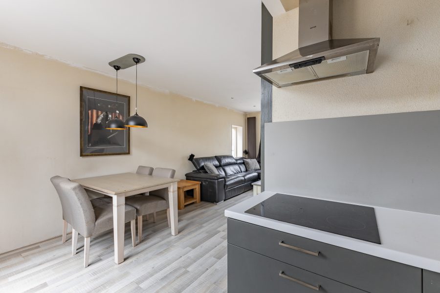 The open, L-shaped kitchen is located on the garden side of the house and features an induction hob, fridge and a freezer. Behind the kitchen, there is a handy utility room where you will find the connections for the white goods set-up, a separate toilet and a back door to the garden.