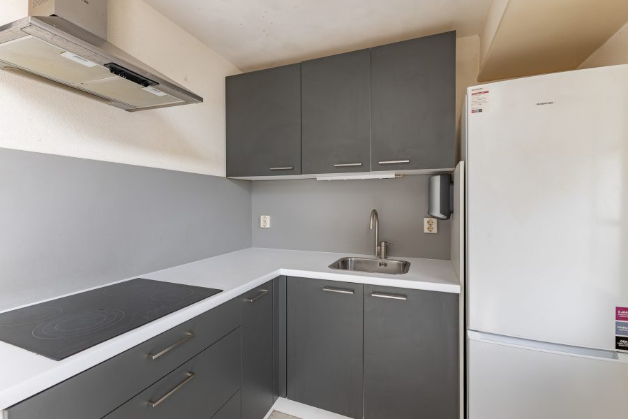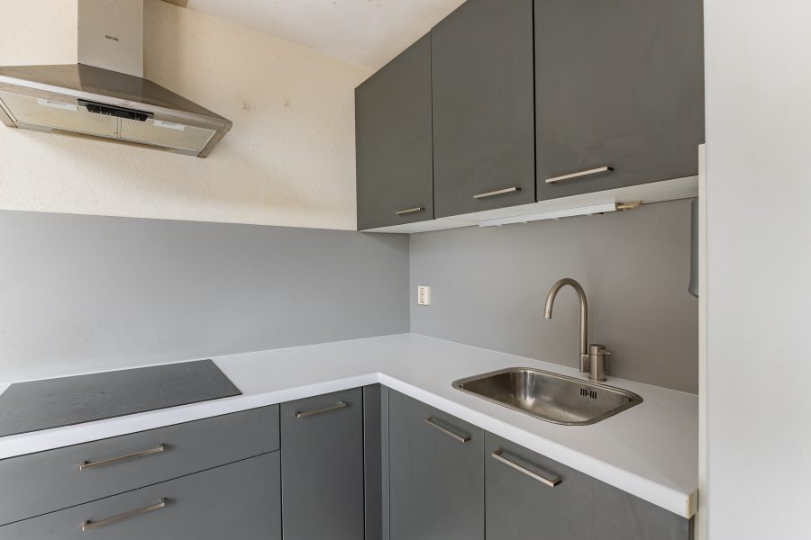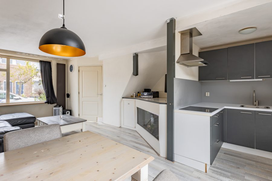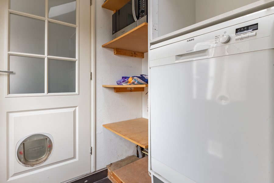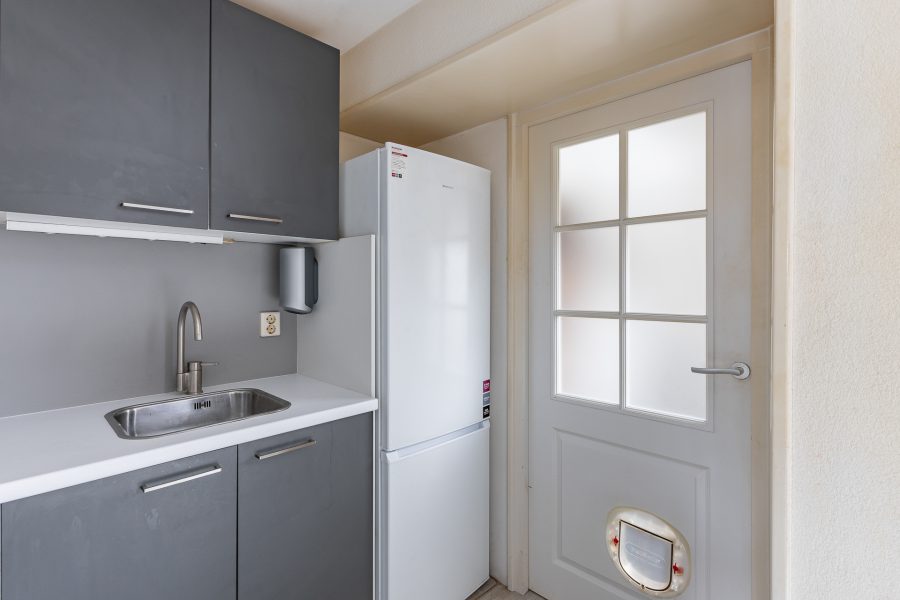 De open, L-vormige keuken bevindt zich aan de tuinzijde van de woning en beschikt over een inductiefornuis, koelkast en een vriezer. Achter de keuken zit een handige bijkeuken met aldaar de aansluitingen voor de witgoedopstelling, een separaat toilet en een achterdeur naar de tuin.