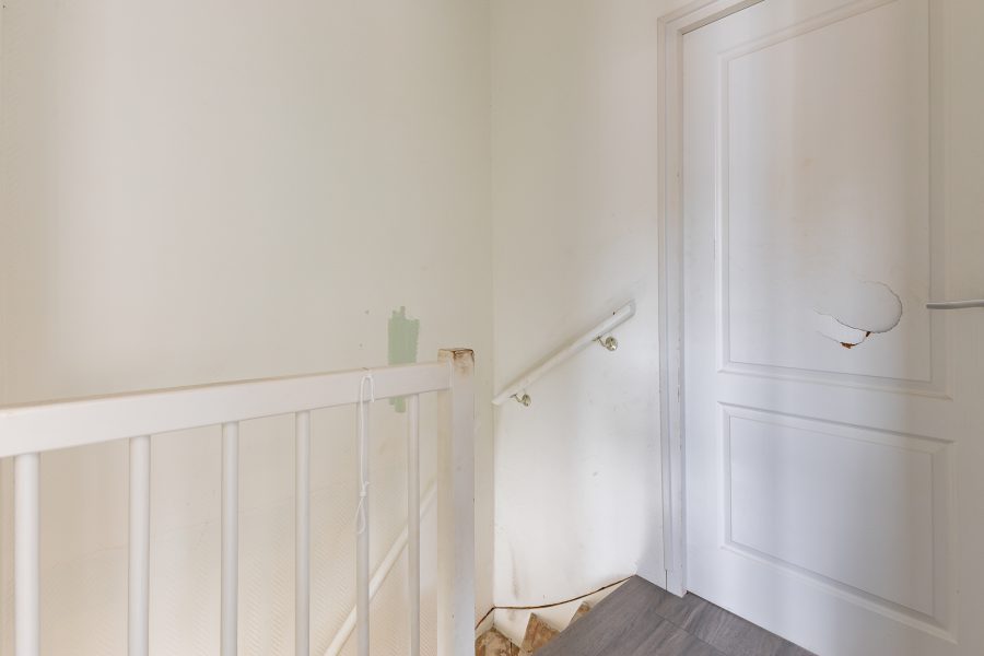 Via the stairs in the hall, we reach the landing of the first floor. On this floor, we find 2 bedrooms and the bathroom. Both bedrooms are finished with a laminate floor and the largest bedroom has a built-in wall cupboard.