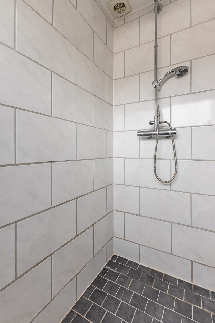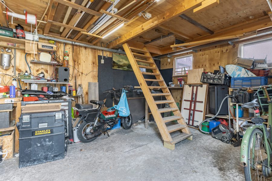 The low-maintenance back garden is facing south-west and is mostly tiled. At the back of the garden there is a large stone shed which is equipped with electricity and has a fixed staircase to a large (storage) attic.