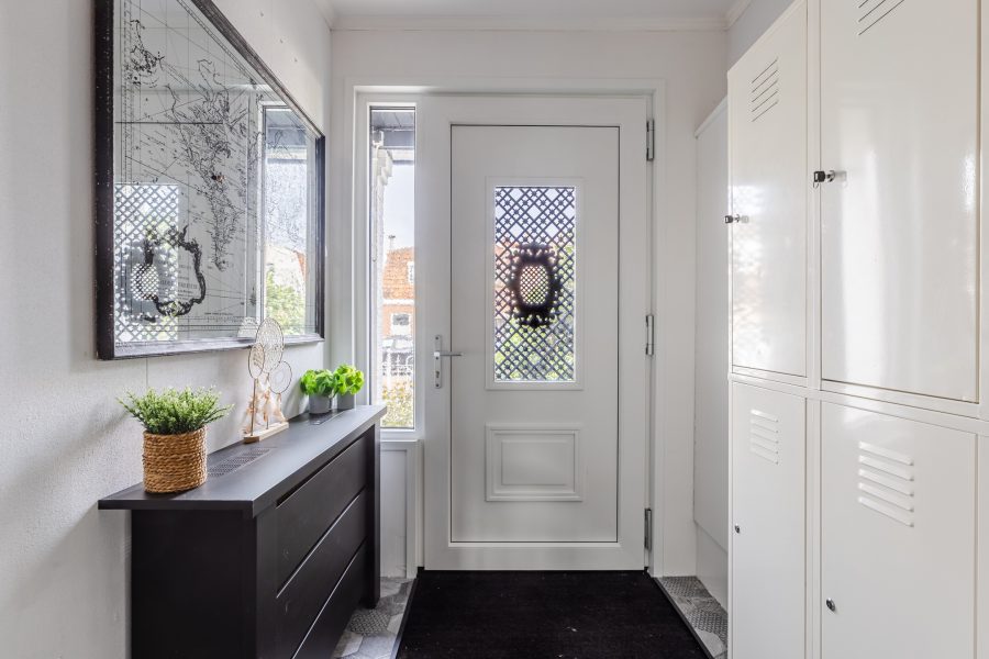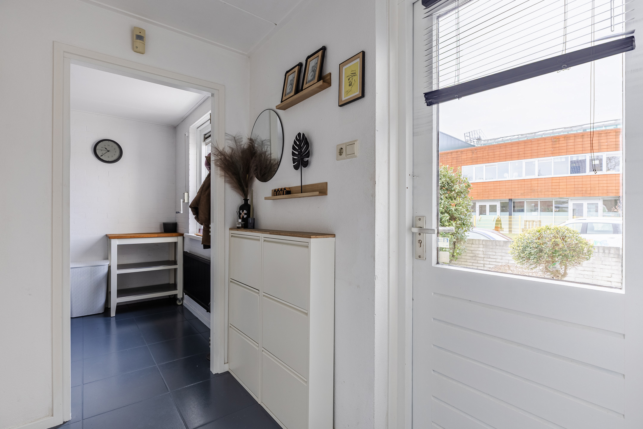 Via de betegelde voortuin bereik je de overdekte voordeur van de woning. Achter de voordeur bevindt zich een ruime entreehal met meterkast, garderobe, trap naar de eerste verdieping en toegang tot de woonkamer. De entreehal is netjes afgewerkt met een tegelvloer.