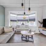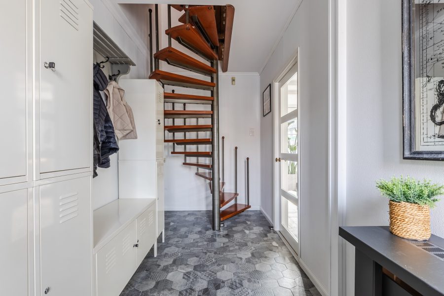 Through the tiled front yard, you reach the covered front door of the home. Behind the front door is a spacious entrance hall with a meter cupboard, wardrobe, stairs to the first floor and access to the living room. The entrance hall features a tiled floor.