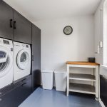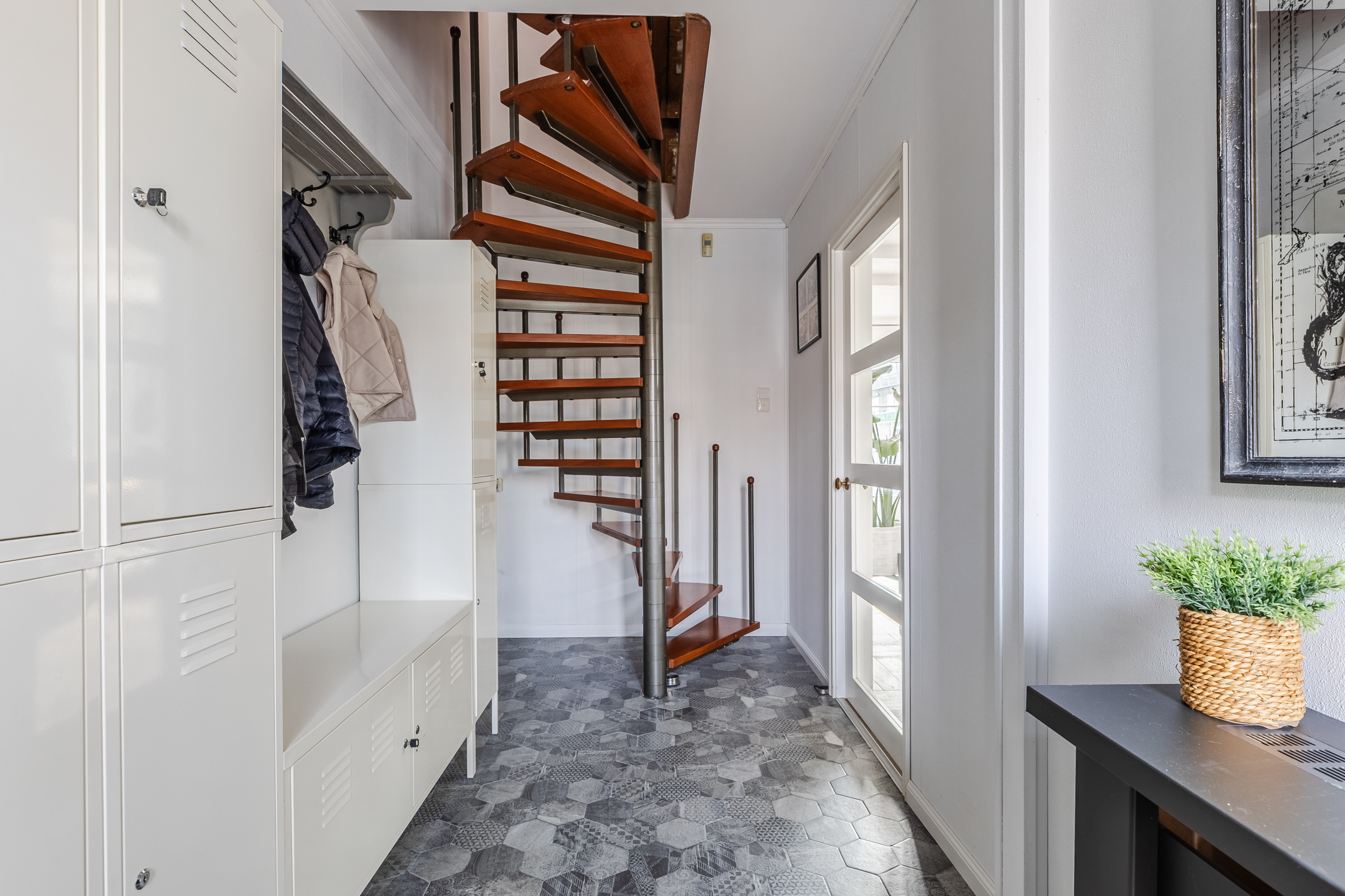 The kitchen opens onto a hallway. From here, you can access the backyard, a storage closet, the toilet room and the utility room. The practical utility room is equipped with connections for a washer and dryer and also offers space for storage.