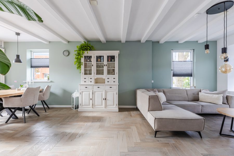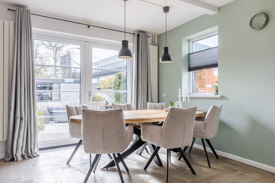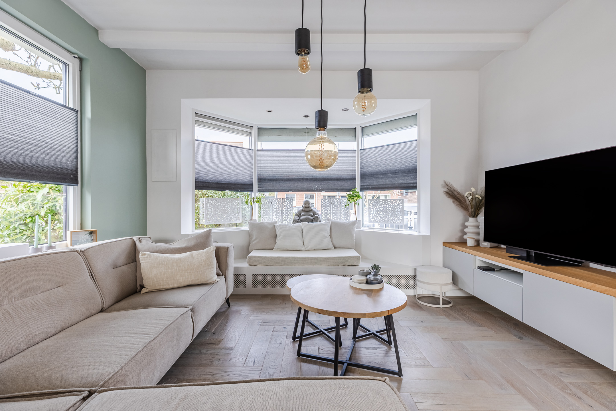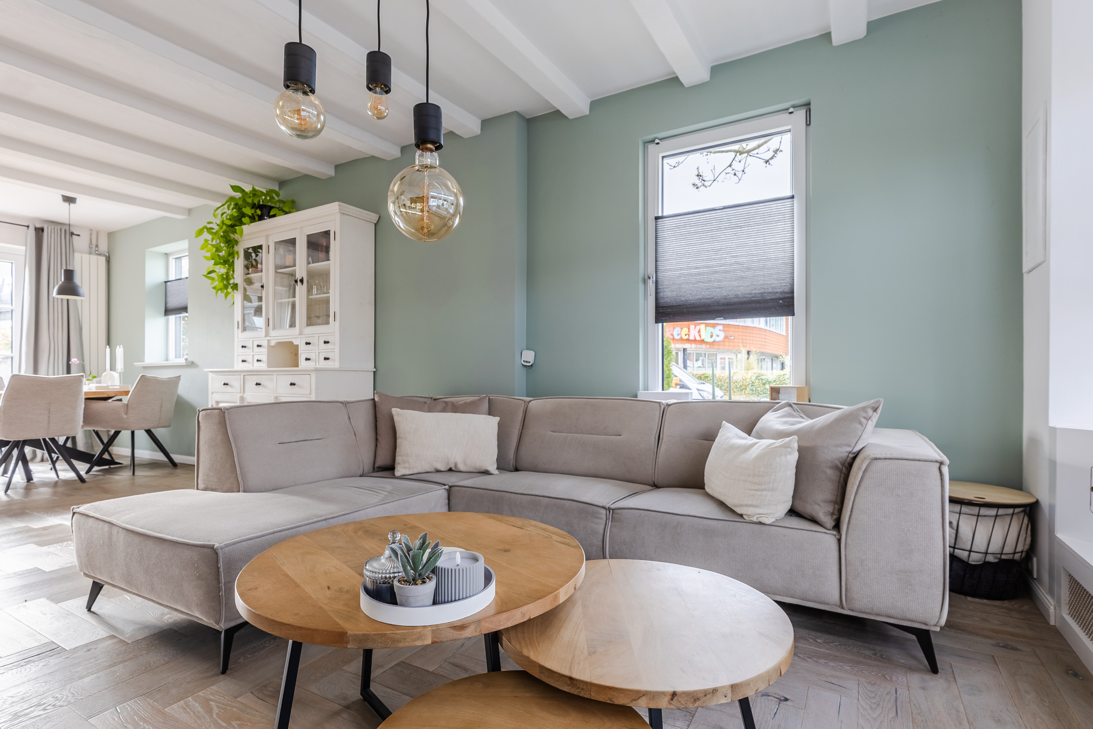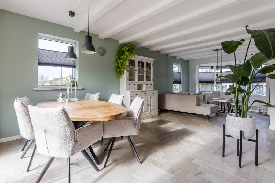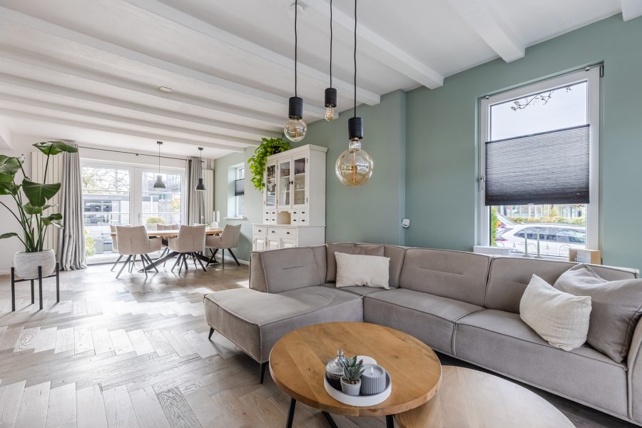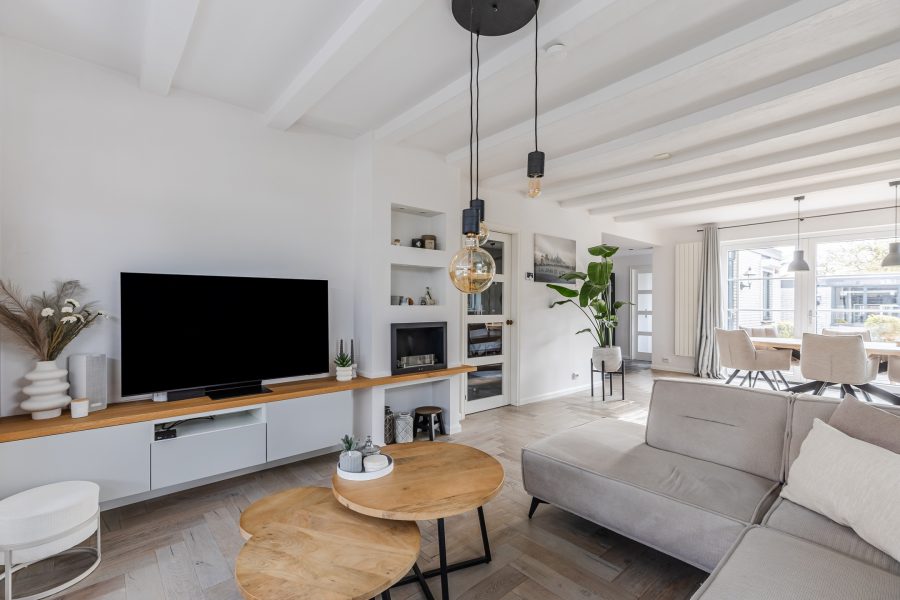 In de royale woonkamer ligt een eikenhouten parketvloer en zijn de wanden fraai afgewerkt. Enkele klassieke details zijn hier bewaard gebleven, zoals het balkenplafond en de erker. Ook de inbouwhaard zorgt voor sfeer. Dankzij de grote ramen en openslaande tuindeuren valt er veel natuurlijk licht binnen.