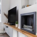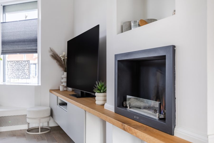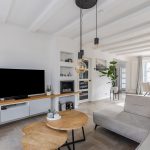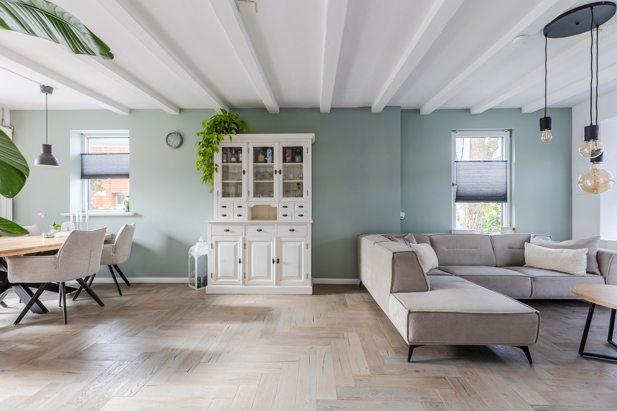 The spacious living room features a wood-colored floor and beautifully finished walls. Some classic details have been preserved here, such as the beamed ceiling and the bay window. The built-in fireplace also adds to the ambiance. Thanks to the large windows and garden doors, plenty of natural light floods in.