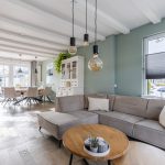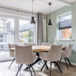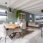 In the kitchen area you will find a beautiful tiled floor. The kitchen (2018) is a corner unit with a stylish design, featuring wood-colored cabinet fronts and a black countertop. It is equipped with the following appliances: dishwasher, gas stove, range hood, oven and microwave. The kitchen is illuminated by recessed spotlights.
