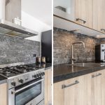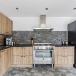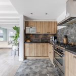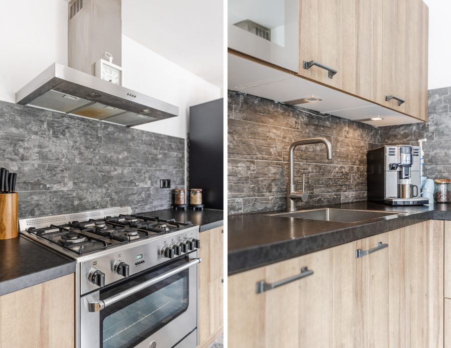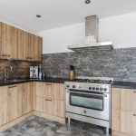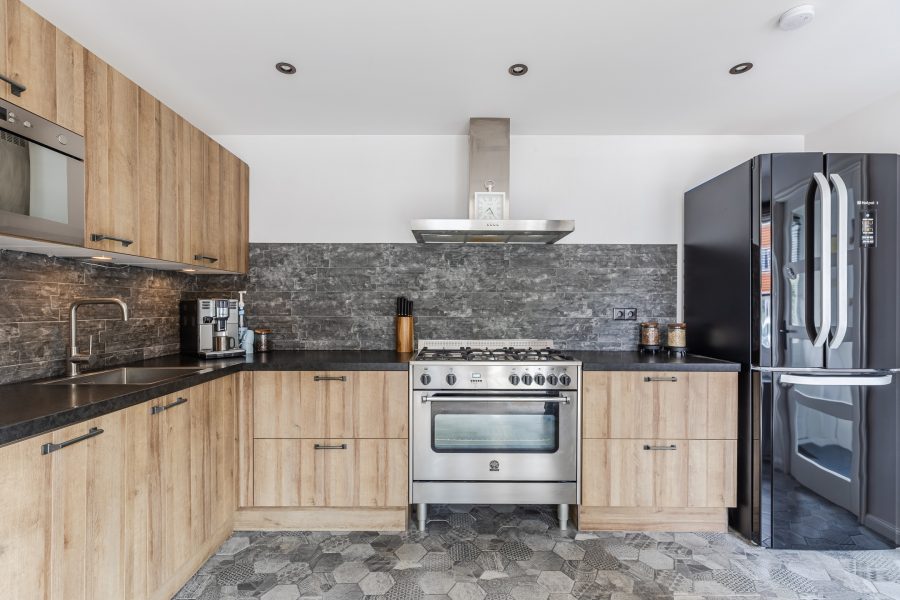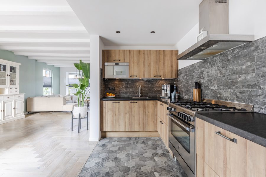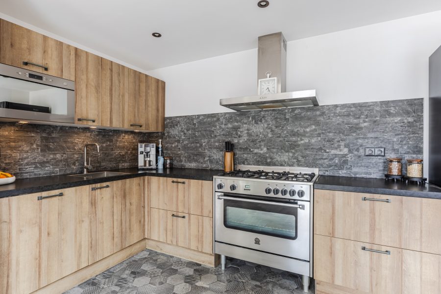 In het keukengedeelte ligt een fraaie tegelvloer. De keuken (2018) is uitgevoerd in een hoekopstelling en heeft een mooi design met houtkleurige fronten en een zwart werkblad. Hier tref je de volgende apparatuur aan: vaatwasser, gasfornuis, afzuigkap, oven en magnetron. De keuken wordt verlicht door inbouwspots.