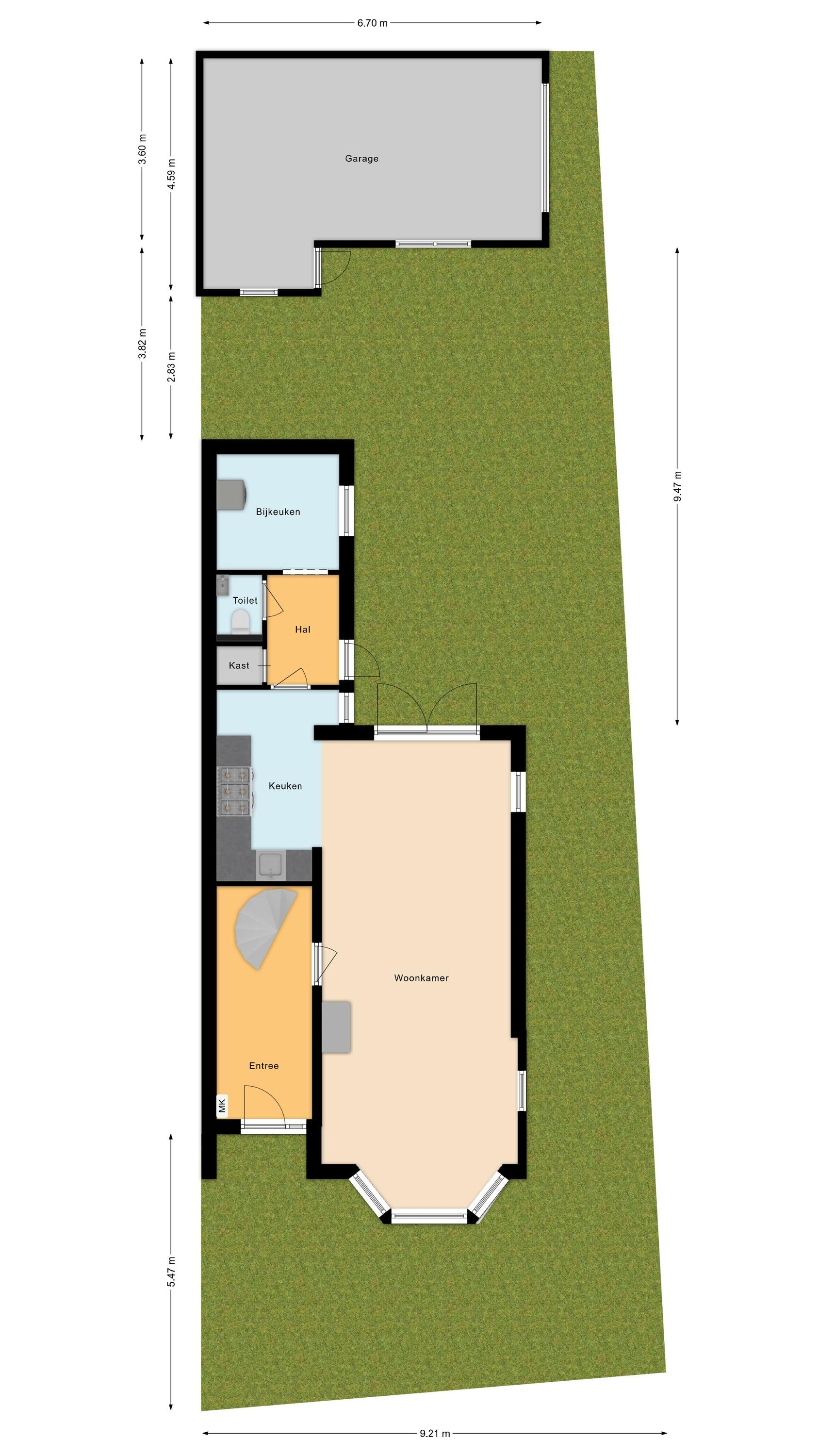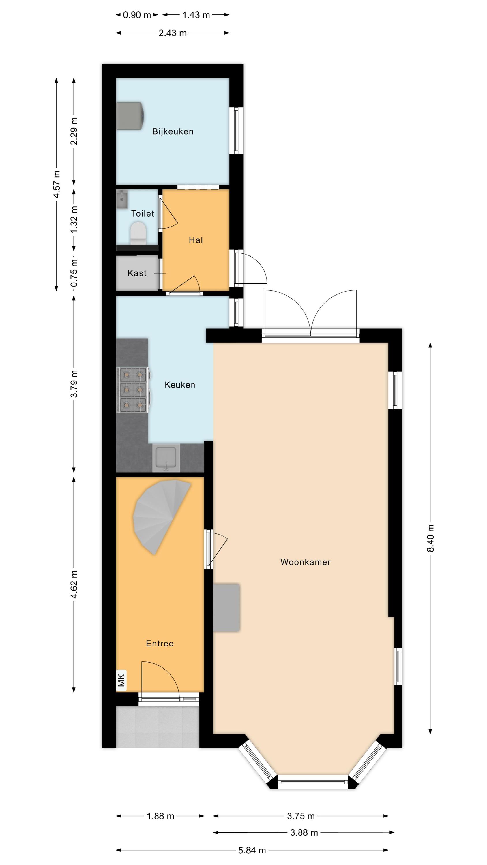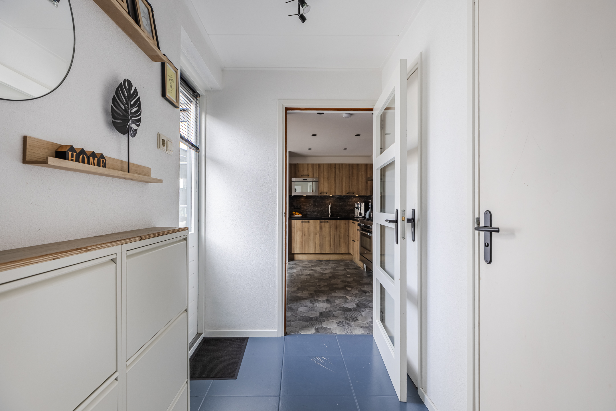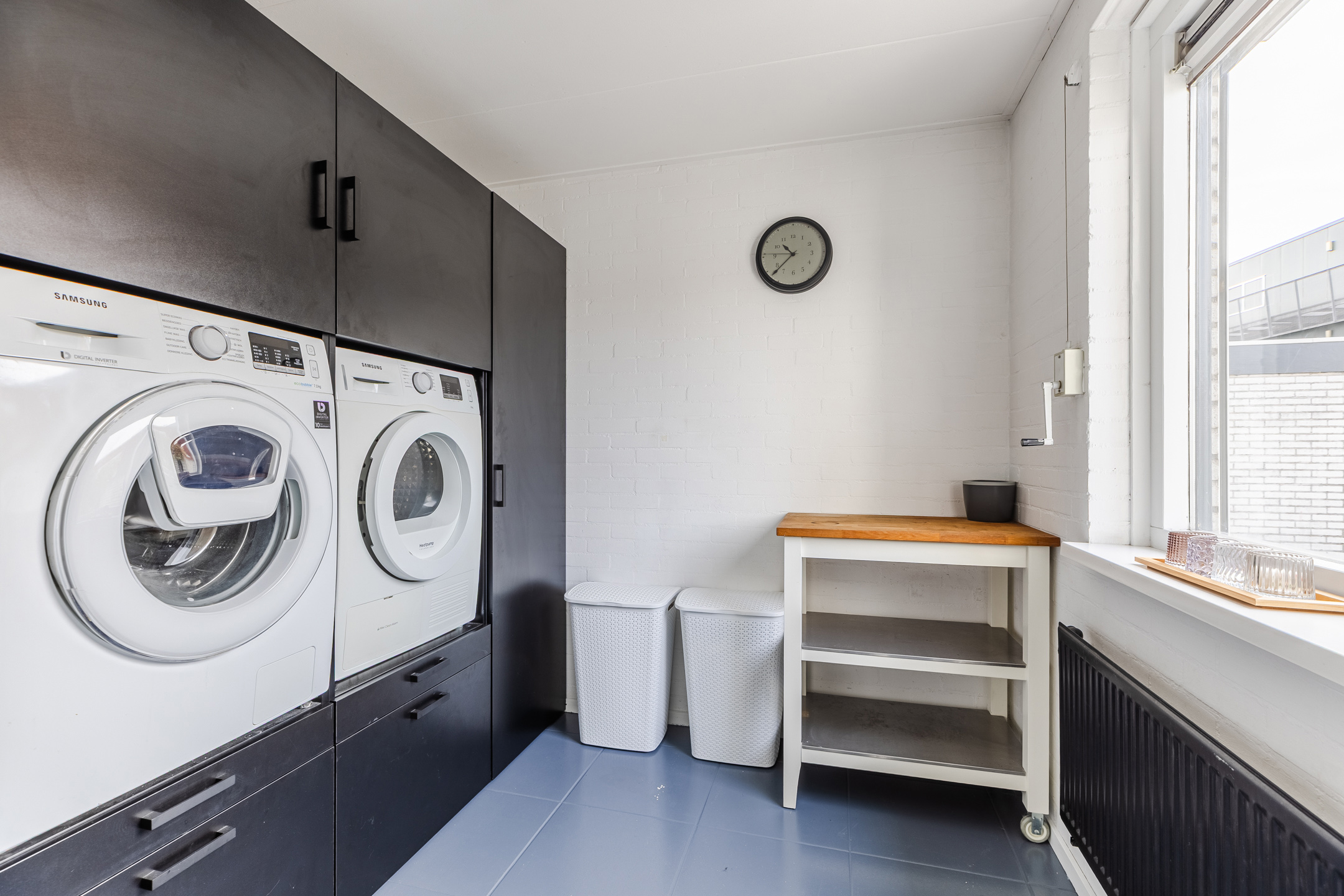 De keuken biedt toegang tot een hal. Vanuit hier zijn de achtertuin, een bergkast, de toiletruimte en de bijkeuken bereikbaar. De praktische bijkeuken is uitgerust met de wasmachine- en drogeraansluitingen en biedt daarnaast ruimte om spullen op te bergen.