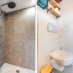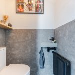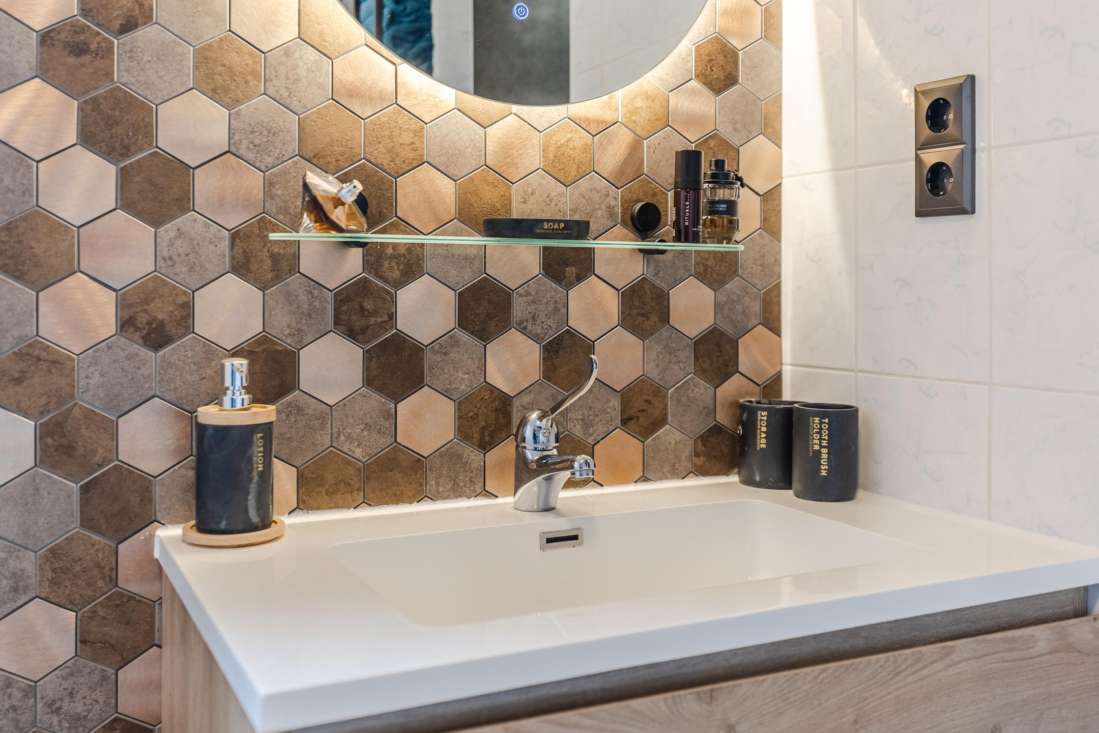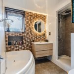 De badkamer ligt centraal op deze verdieping en is netjes onderhouden. Deze ruimte is uitgerust met een zwevend toilet, badmeubel met wastafel, ligbad en inloopdouche met regendouche.