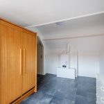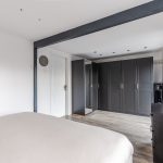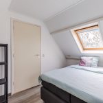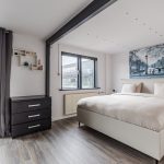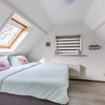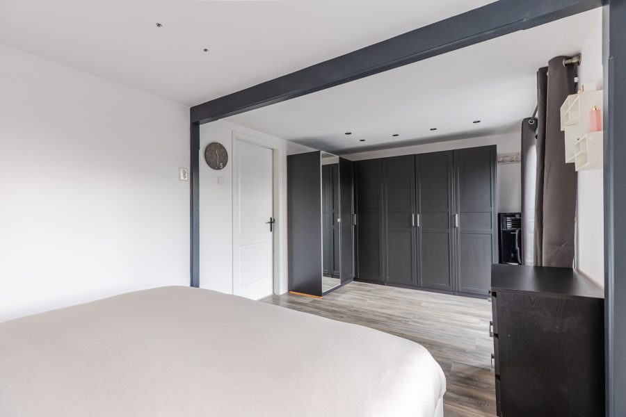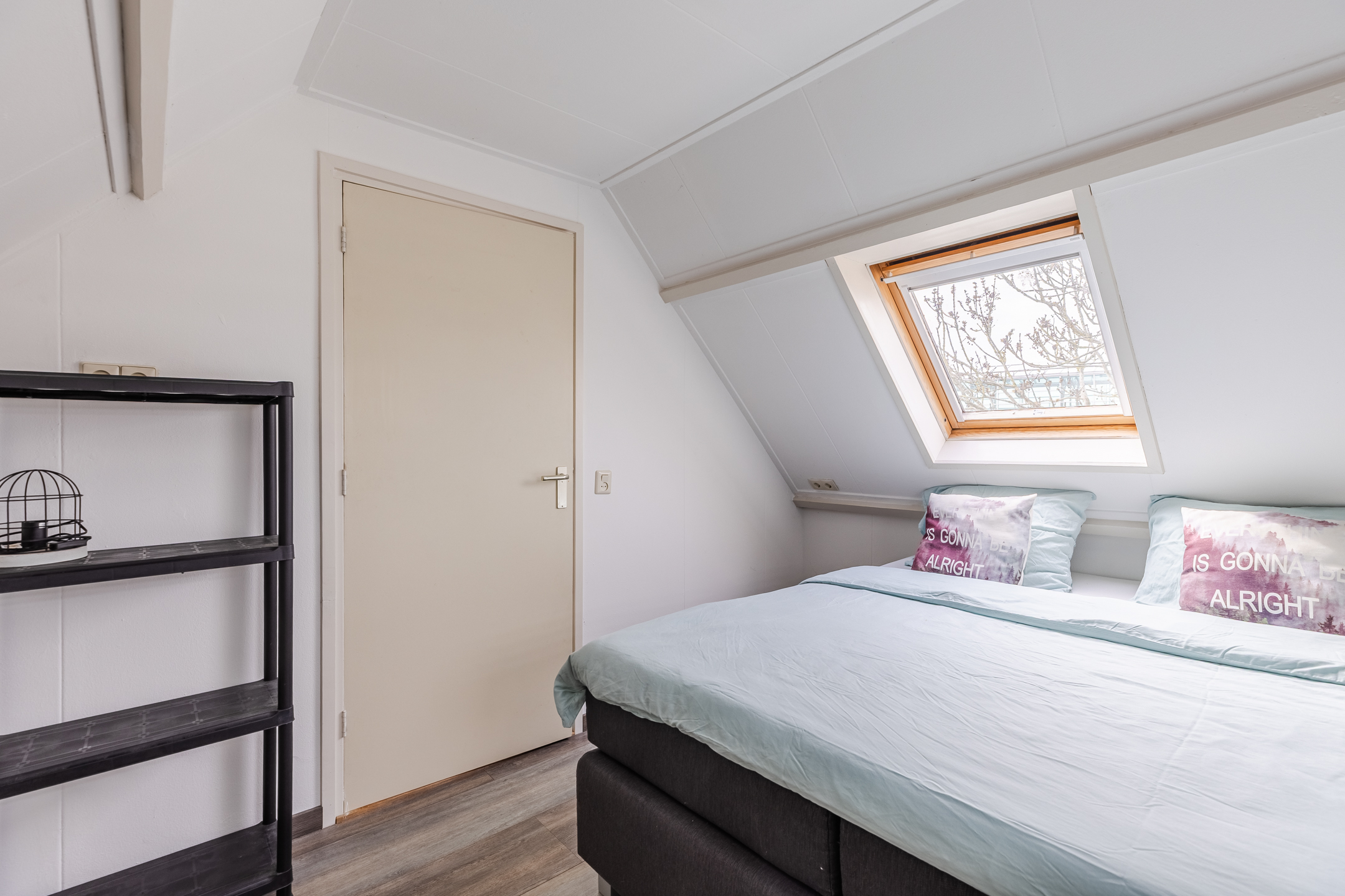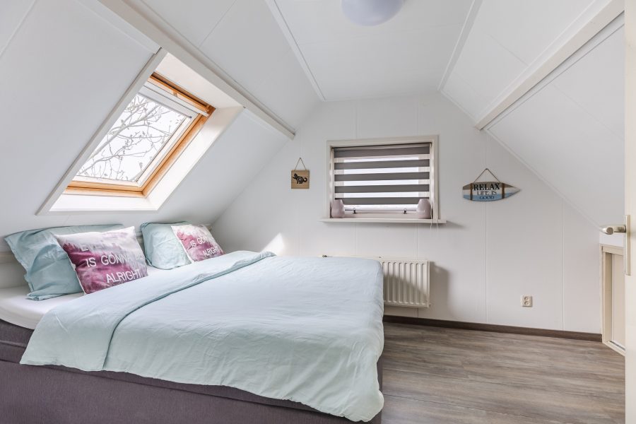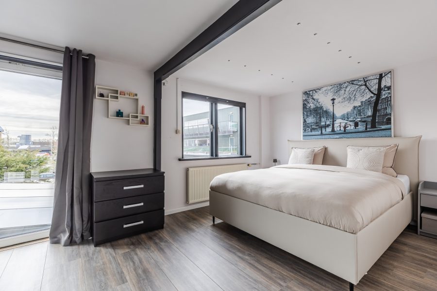 De slaapkamer op deze verdieping is voorzien van een fraaie vloer en strakke wanden. Twee grote ramen zorgen hier voor een aangename lichtinval.