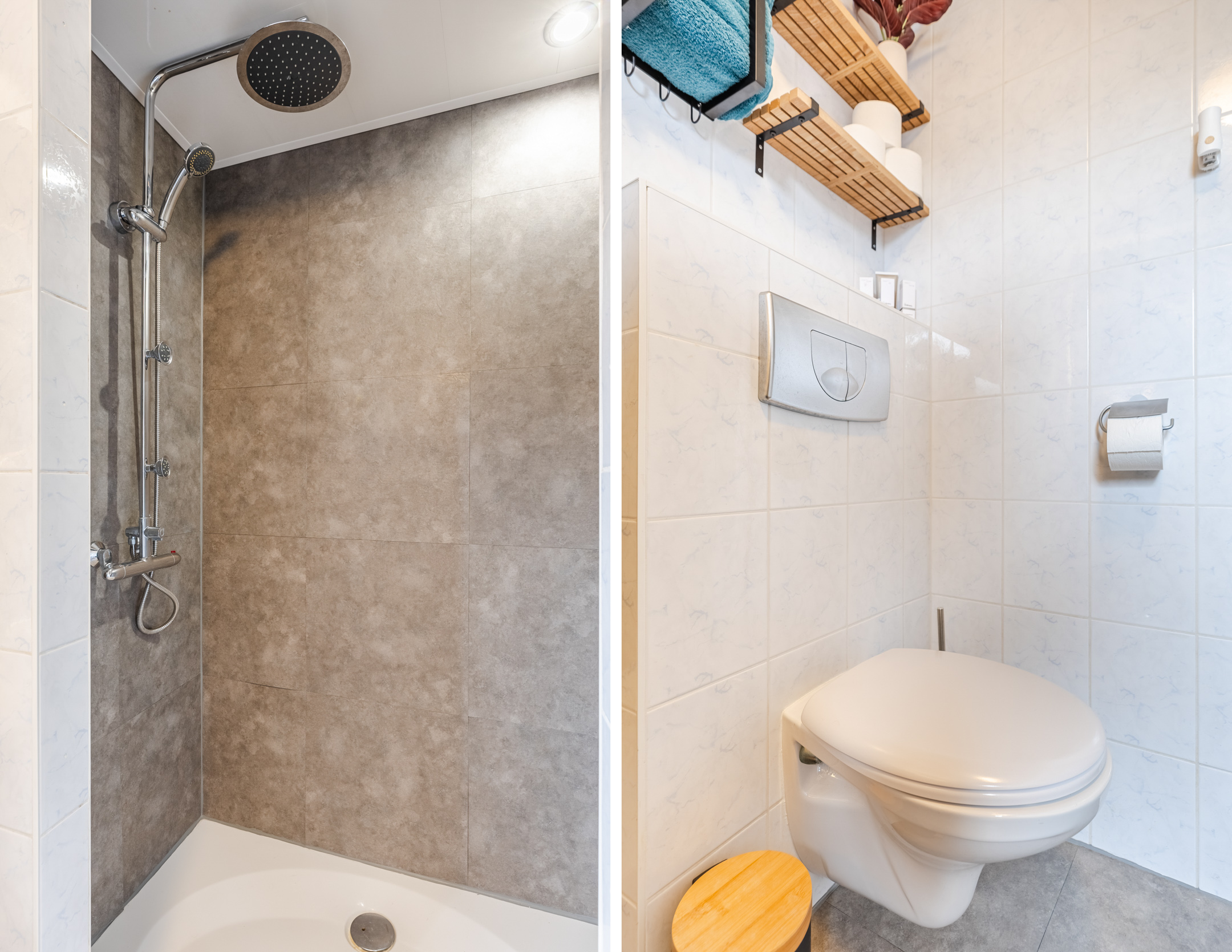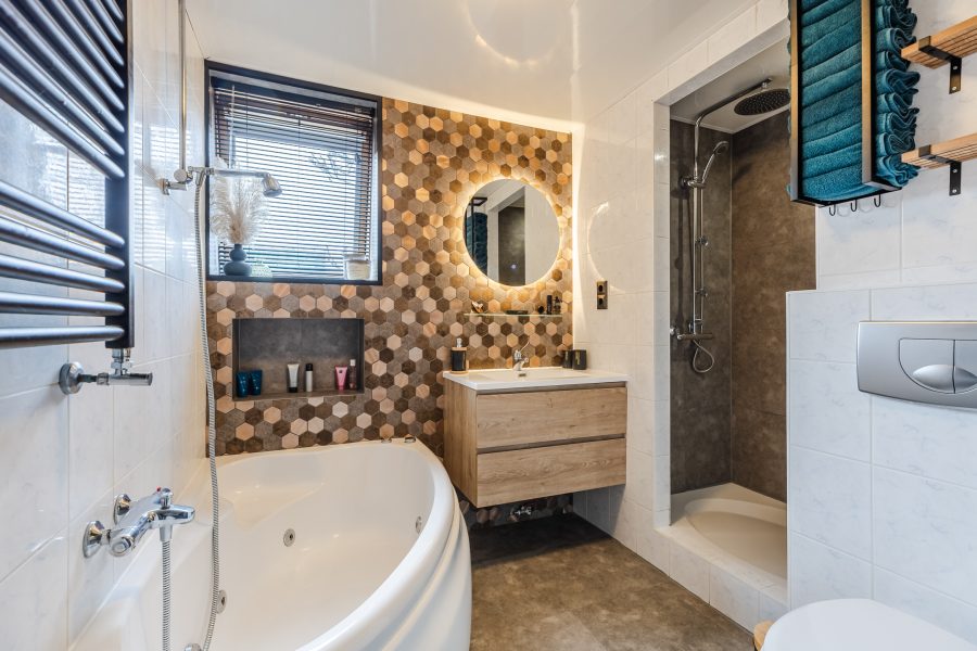 • Keurig verzorgde badkamer met toilet, wastafel, ligbad en inloopdouche