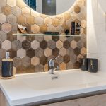 The bathroom is centrally located on this floor and is well-maintained. This room is equipped with a floating toilet, vanity unit with sink, bathtub and walk-in shower with rain showerhead.
