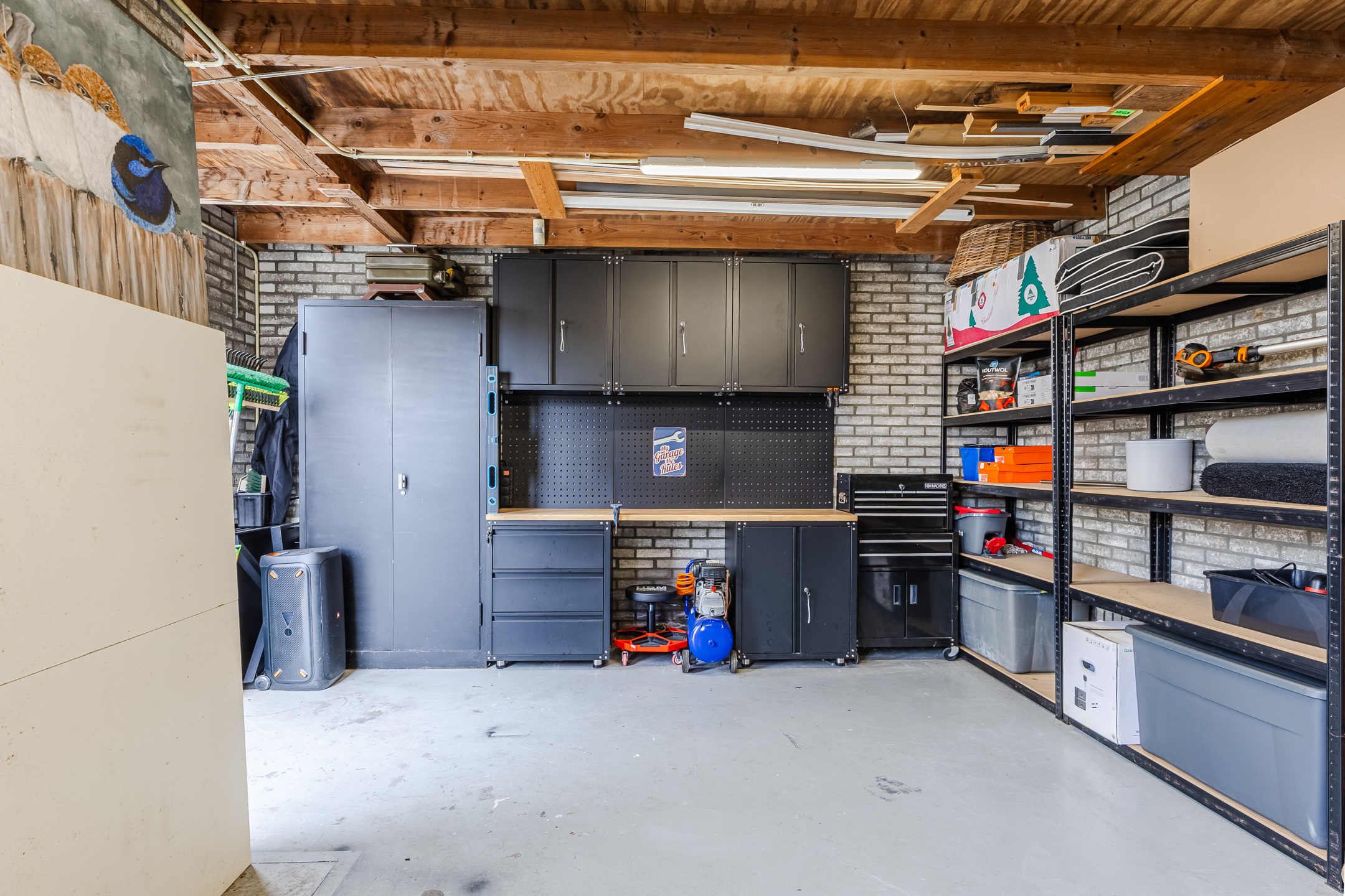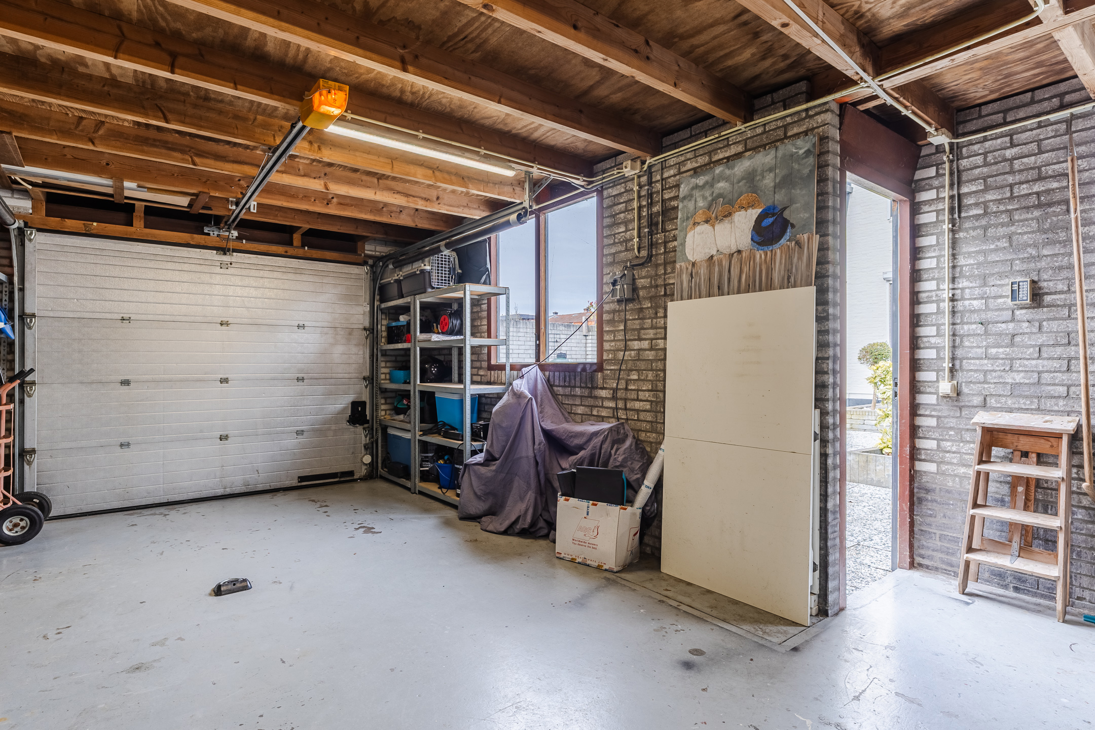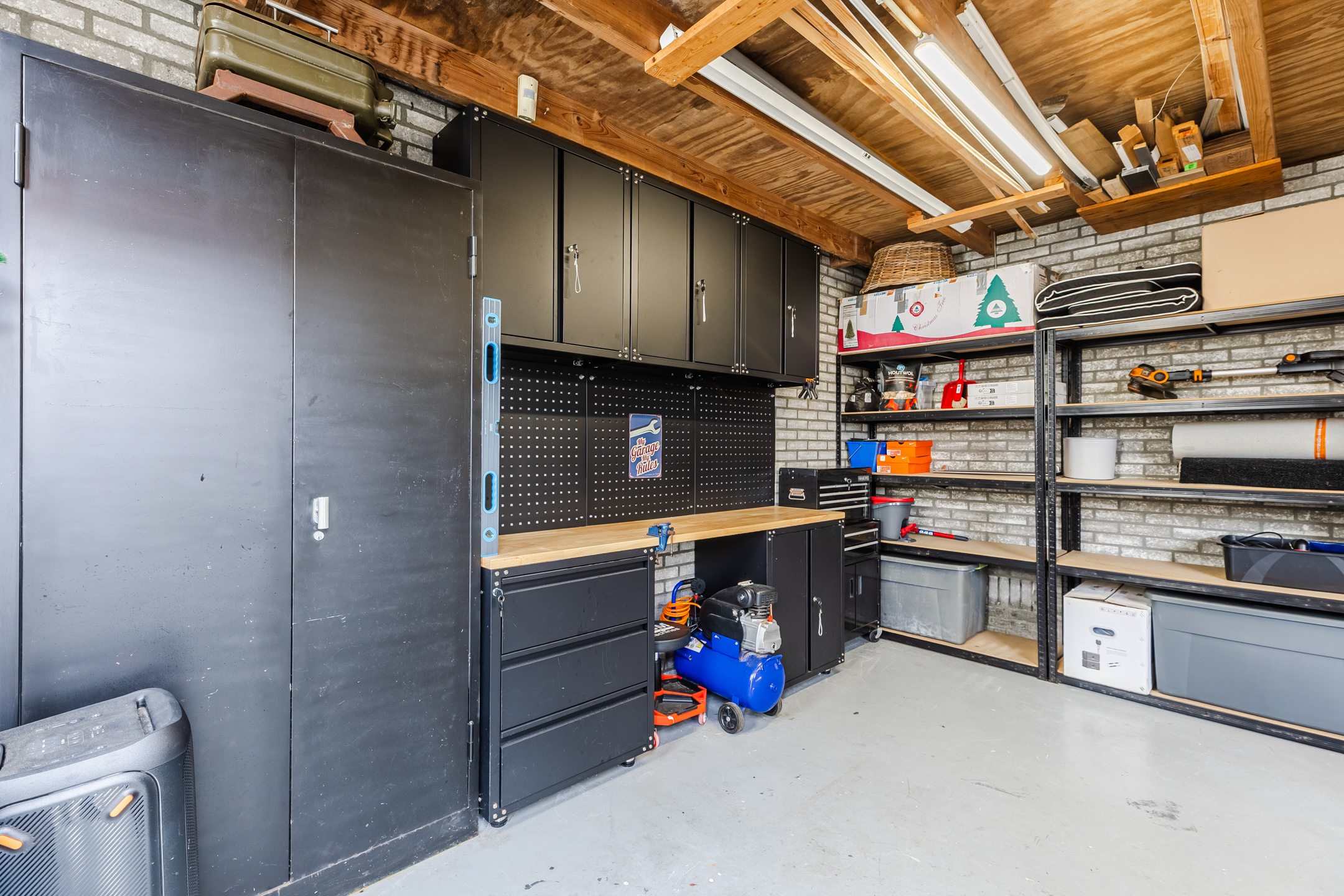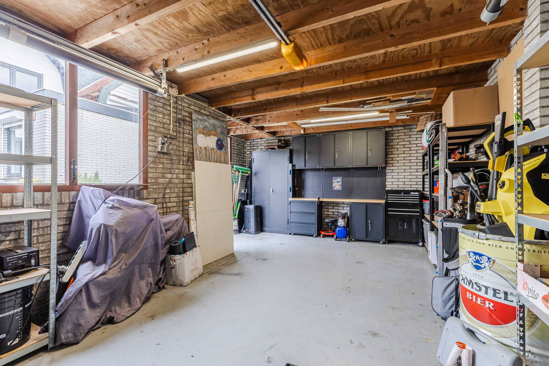 Achterin de tuin bevindt zich een stenen garage. Deze biedt niet alleen parkeergelegenheid, maar ook voldoende ruimte voor het opbergen van spullen en het stallen van fietsen.