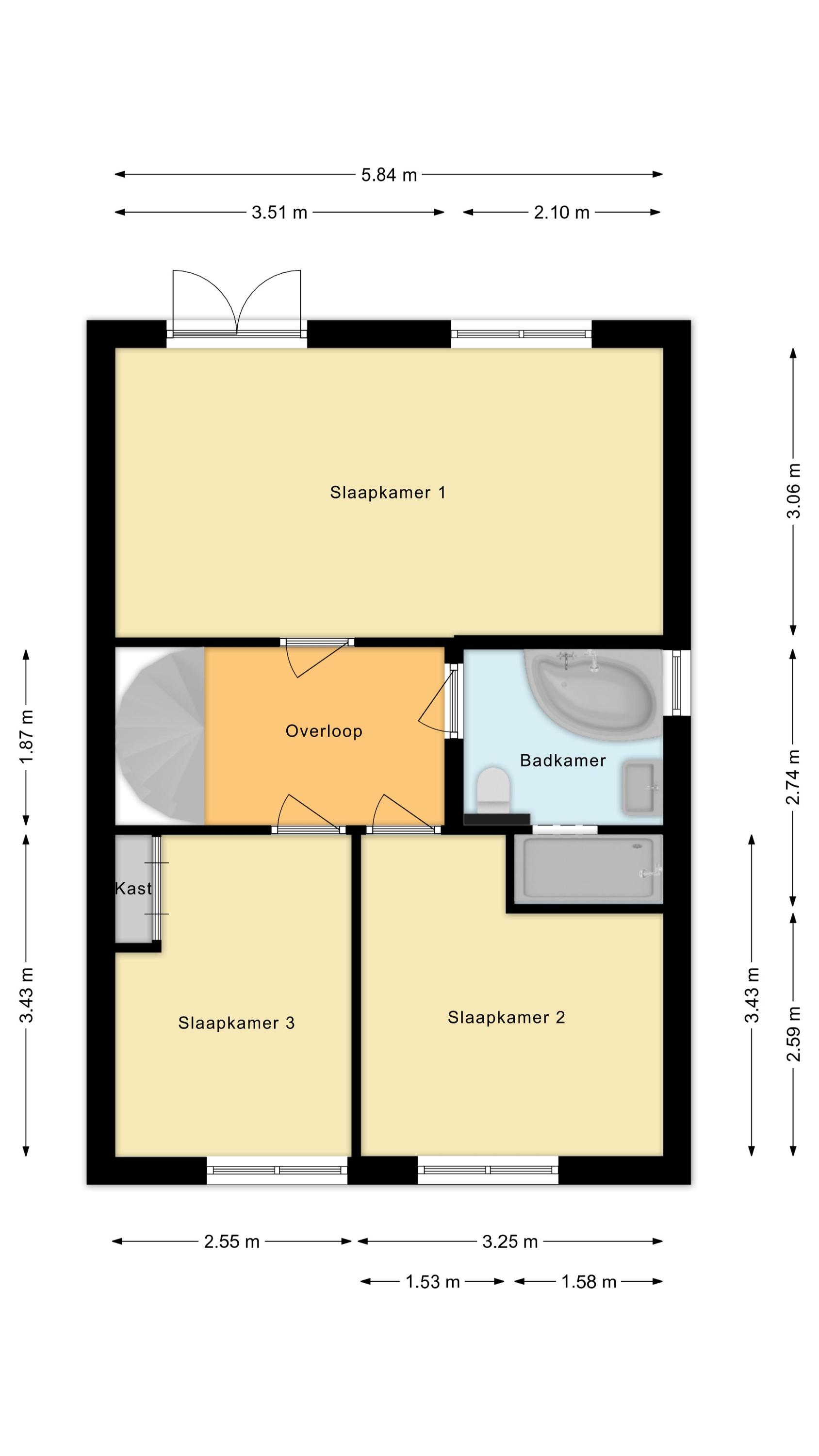 Op deze verdieping vind je de eerste drie slaapkamers en een badkamer. Twee slaapkamers bevinden zich aan de voorzijde en één aan de achterzijde. De kamer aan de achterzijde ligt over de gehele breedte en is daardoor heerlijk ruim. Alle kamers zijn fraai afgewerkt en genieten van veel daglicht.