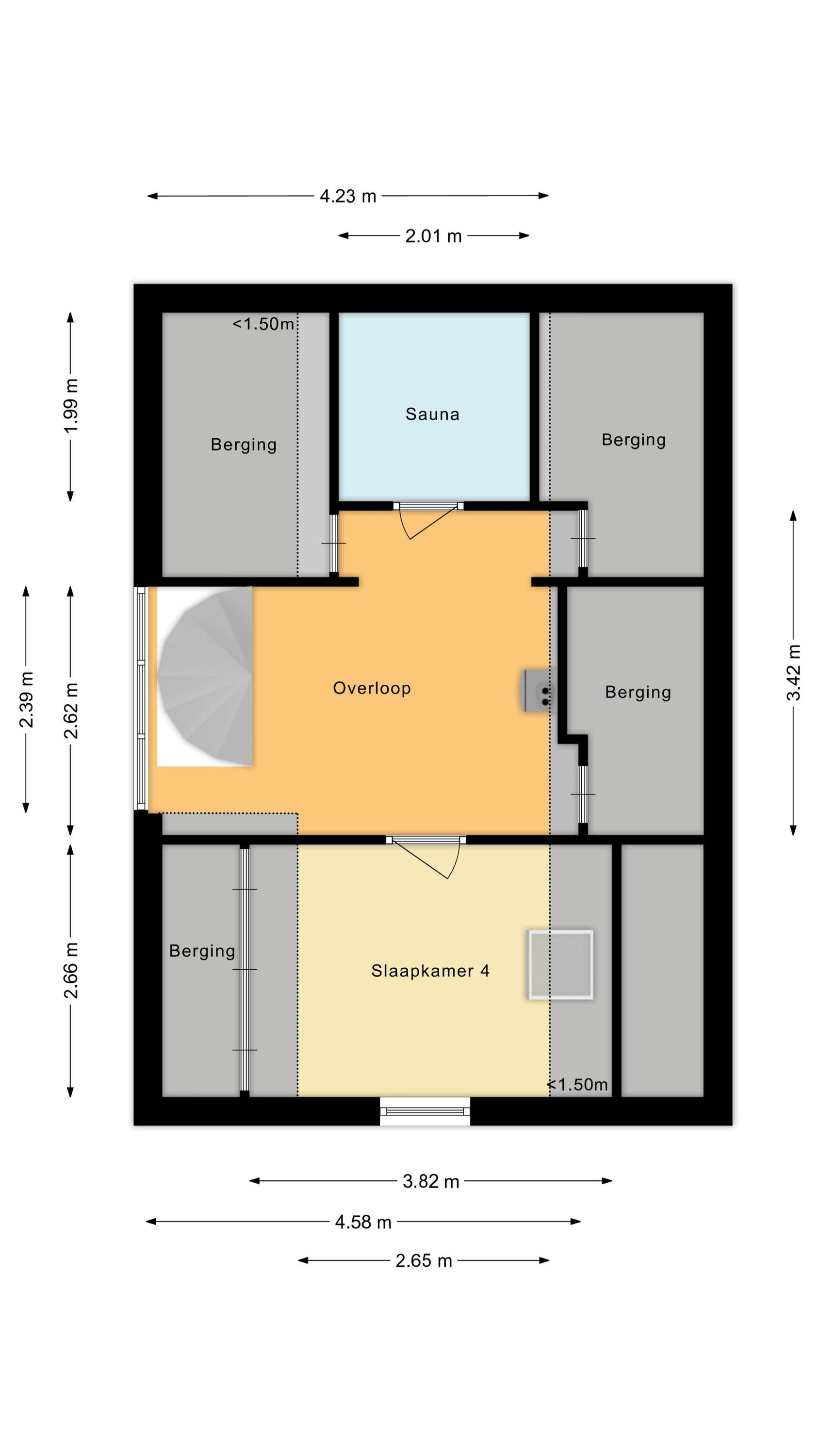 Via de trap op de eerste verdieping bereik je de ruime overloop van deze verdieping. Hier bevindt zich de cv-ketel. Vanaf de overloop is er toegang tot een luxe sauna, meerdere bergingen en de vierde slaapkamer.