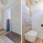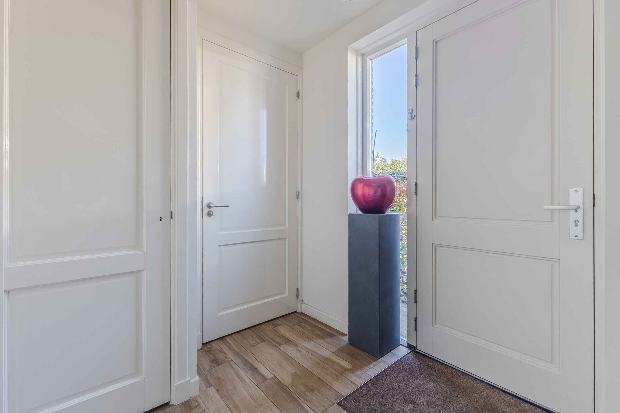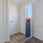 Via the path next to the driveway, you reach the front door on the side of the house. Upon entering, you are welcomed into a spacious and beautifully finished entrance hall. From here, there is access to a modern toilet room with a floating toilet and sink, the meter cupboard, the staircase to the first floor, the stairwell closet and the living room.