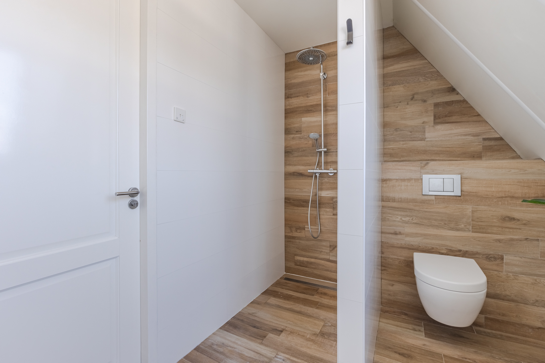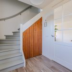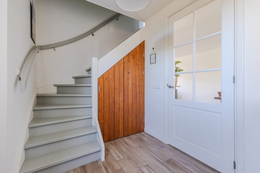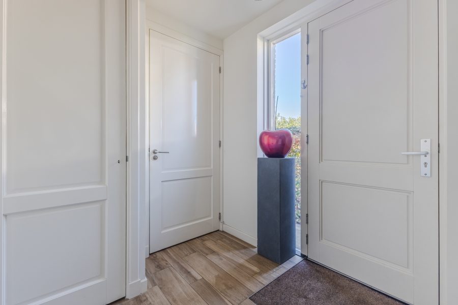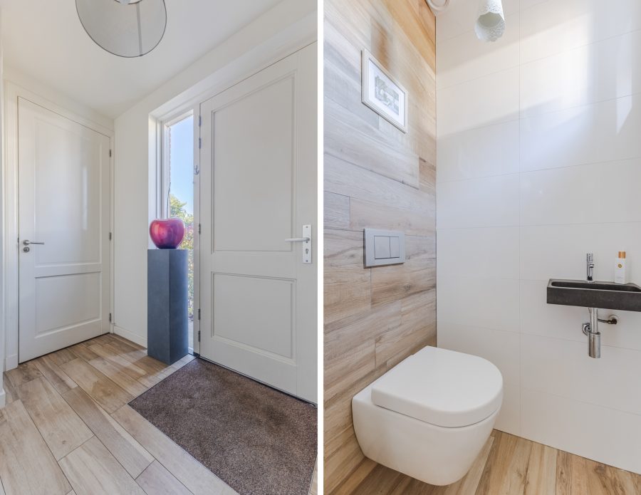 Via het pad naast de oprit bereik je de voordeur aan de zijkant van de woning. Na binnenkomst word je verwelkomd in een ruime en fraai afgewerkte entreehal. Vanuit hier is er toegang tot een moderne toiletruimte met zwevend toilet en fonteintje, de meterkast, de trapopgang naar de eerste verdieping, de trapkast en de woonkamer.