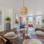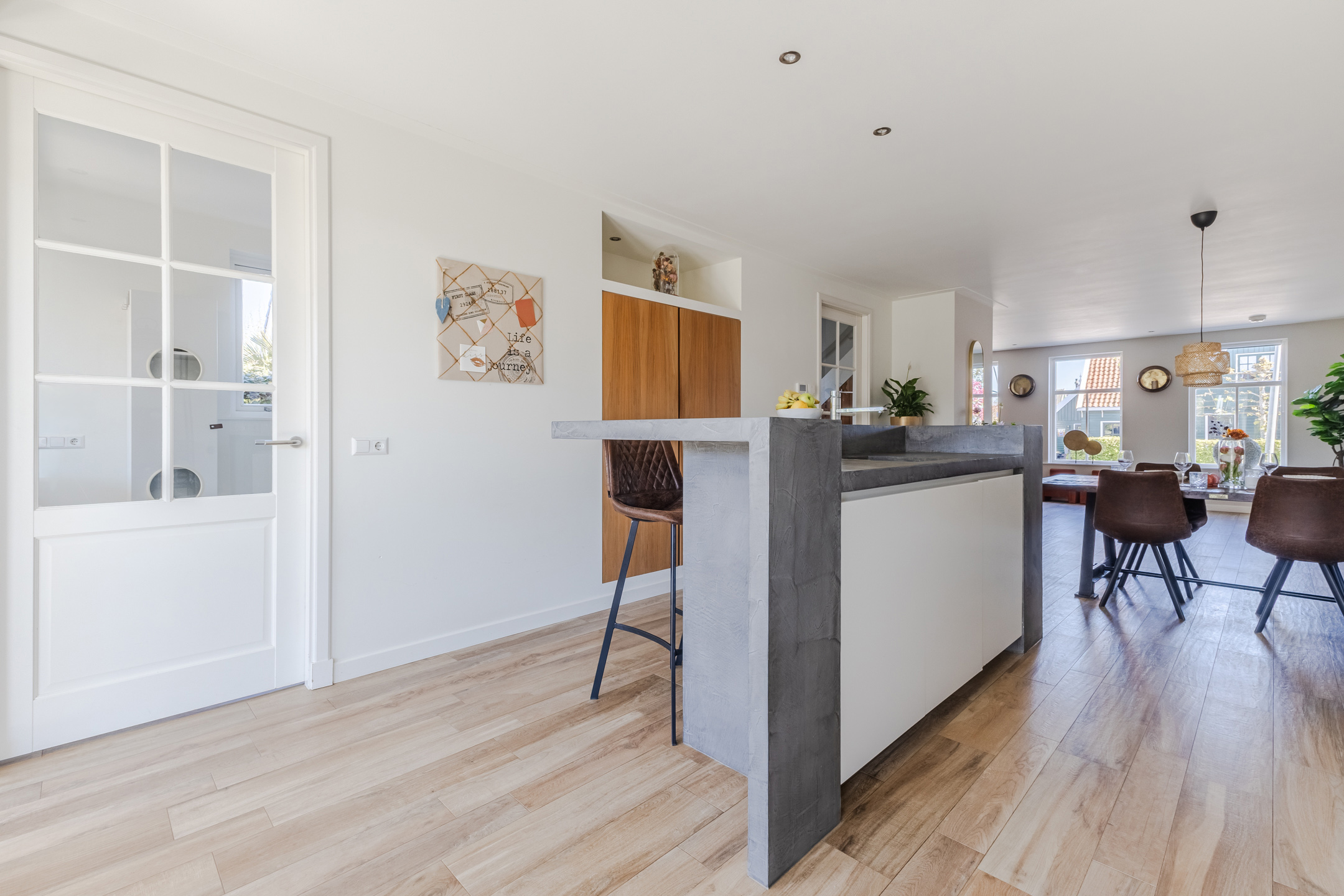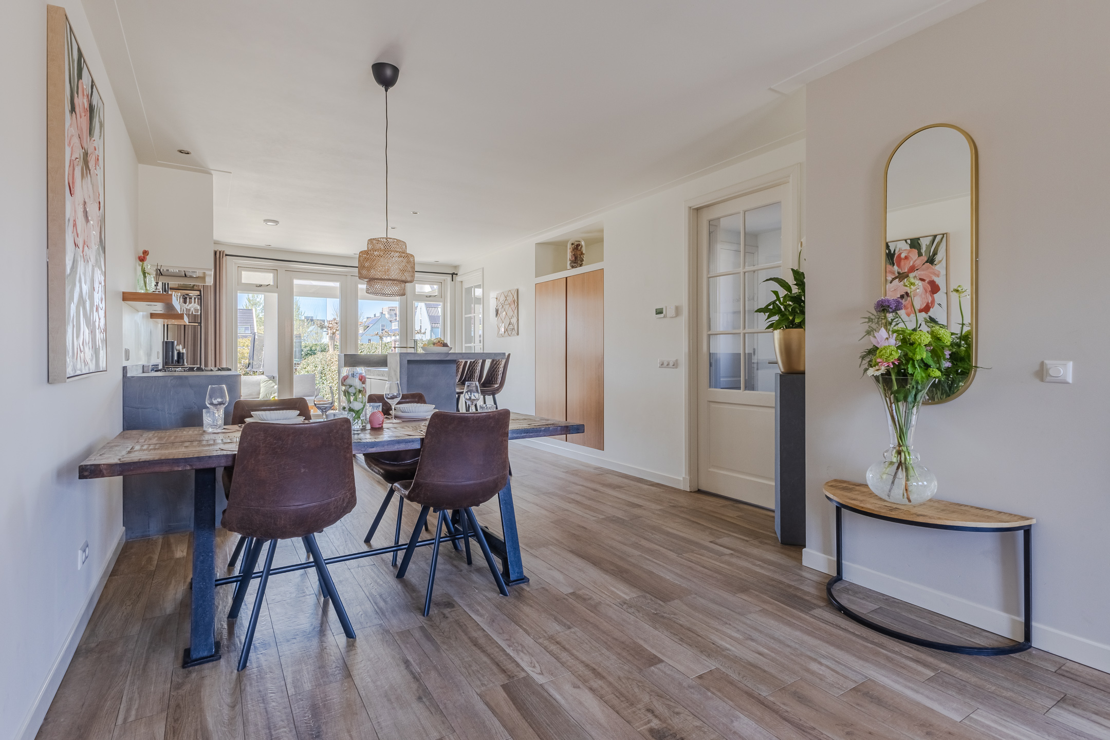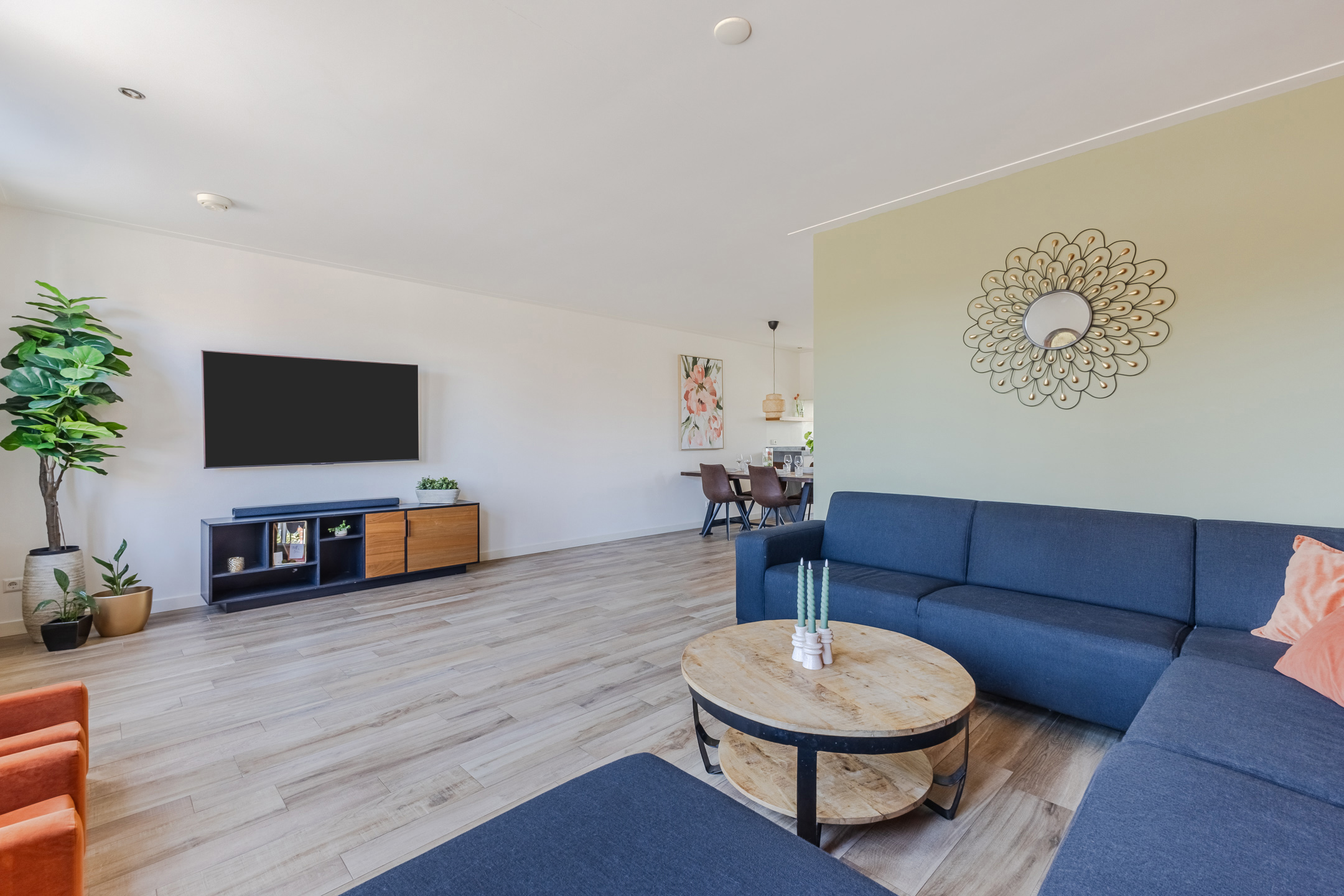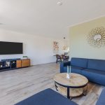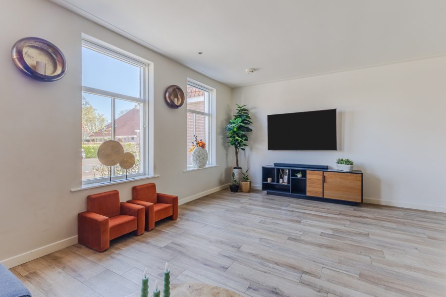 The spacious living room features beautiful flooring with underfloor heating. The walls are neatly finished in various shades. Thanks to the windows at the front and the doors at the back, plenty of natural light floods in. Additionally, the living room is partially lit by recessed spotlights.