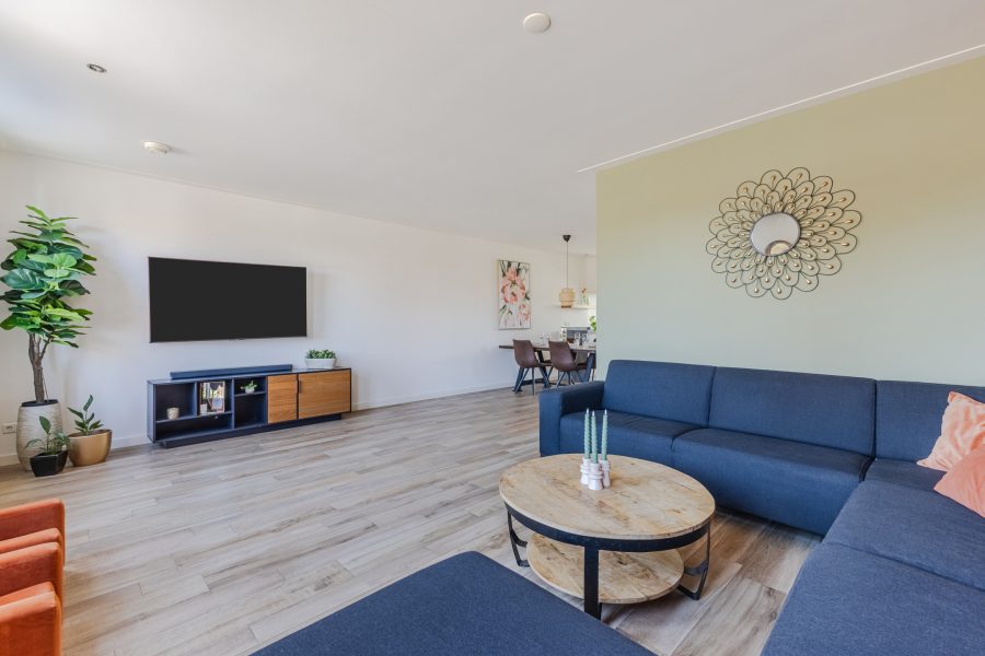 De royale woonkamer is voorzien van een mooie tegelvloer met vloerverwarming. De wanden zijn keurig afgewerkt in verschillende tinten. Dankzij de ramen aan de voorzijde en de openslaande deuren aan de achterzijde valt er veel natuurlijk licht binnen. Verder wordt de woonkamer deels verlicht door inbouwspots.