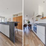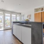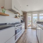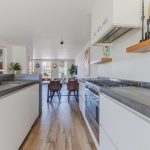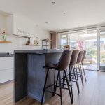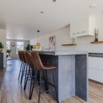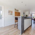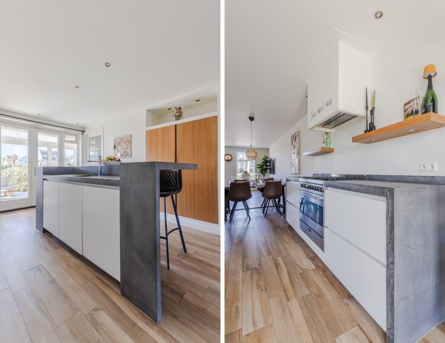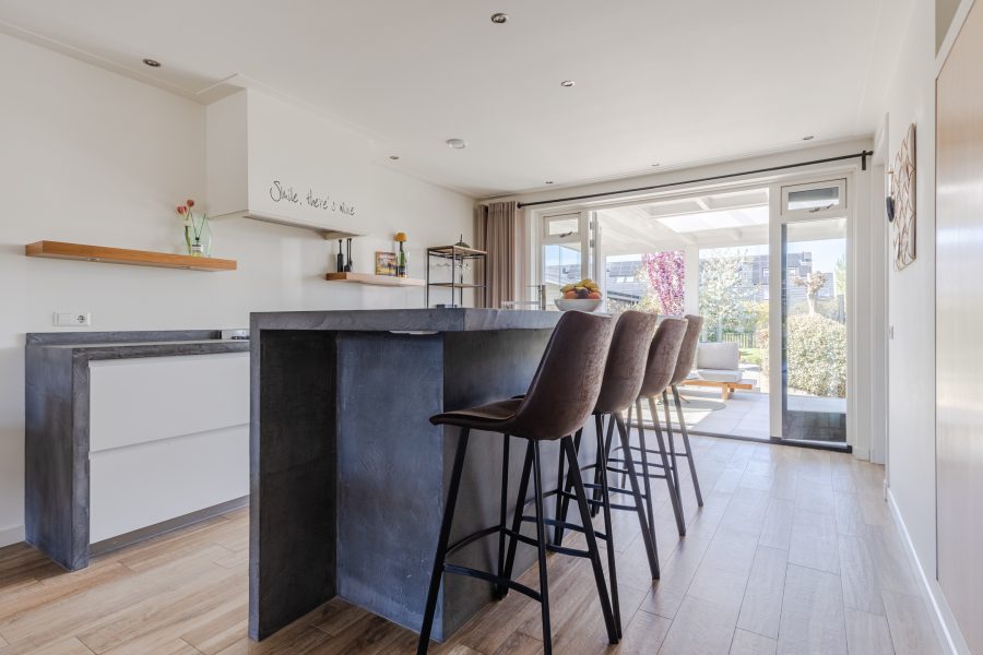 Achterin de woonkamer bevindt zich de moderne, ruime woonkeuken. De keuken is uitgevoerd met een recht keukenblok en een extra keukenopstelling met bar. Het geheel is afgewerkt met witte fronten en grijze werkbladen. De keuken is uitgerust met een vaatwasser, gasfornuis, afzuigkap, oven en koel-vriescombinatie. Aan de keuken grenst een praktische bijkeuken met daarin de aansluitingen voor de wasmachine en droger.