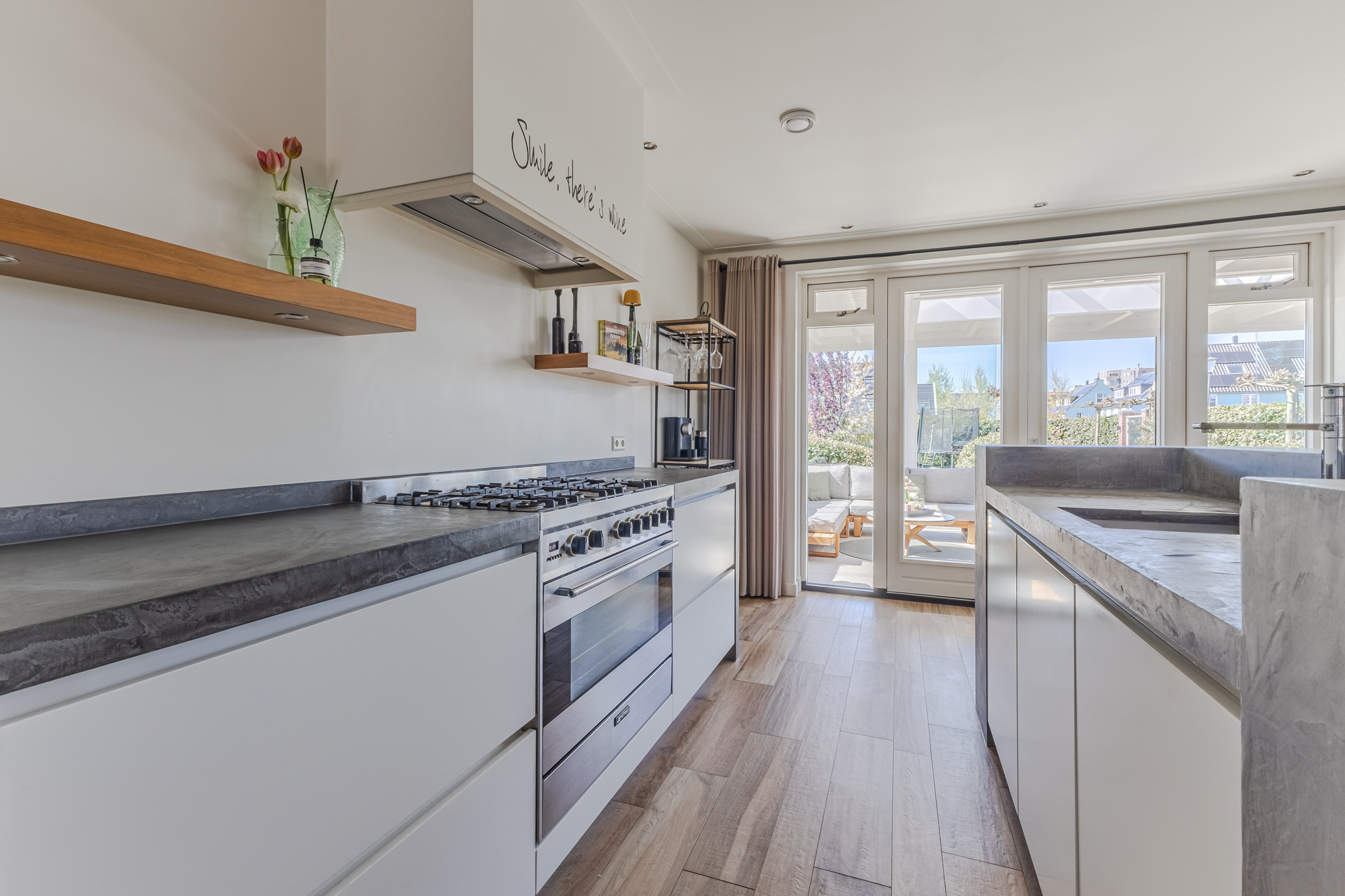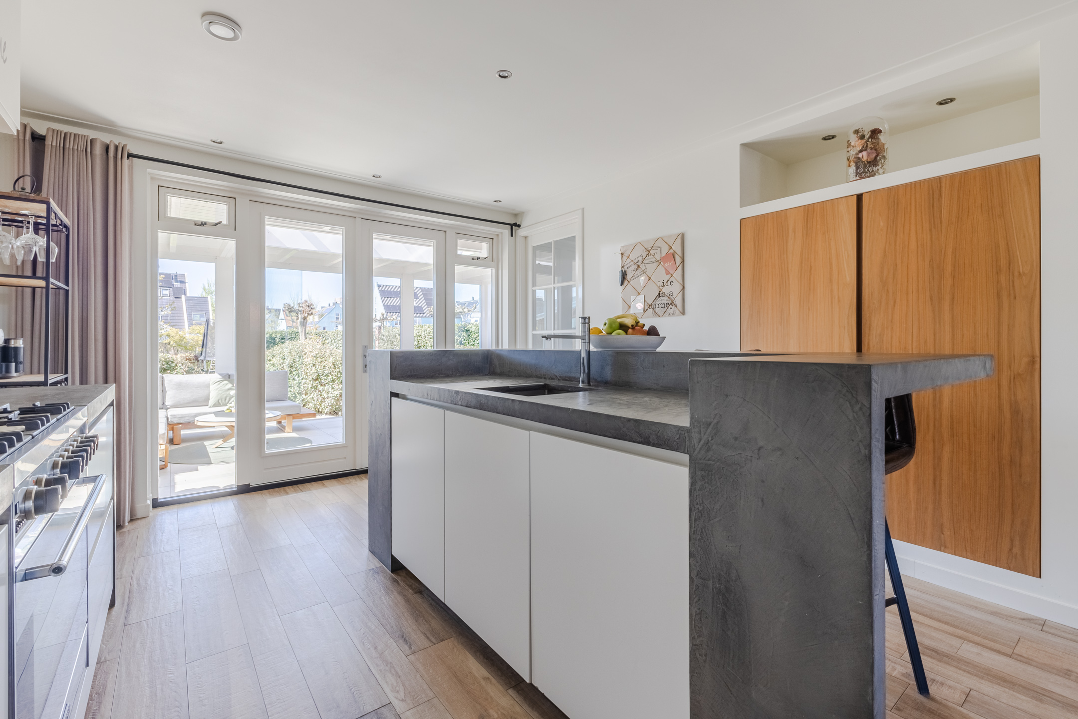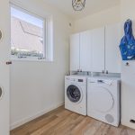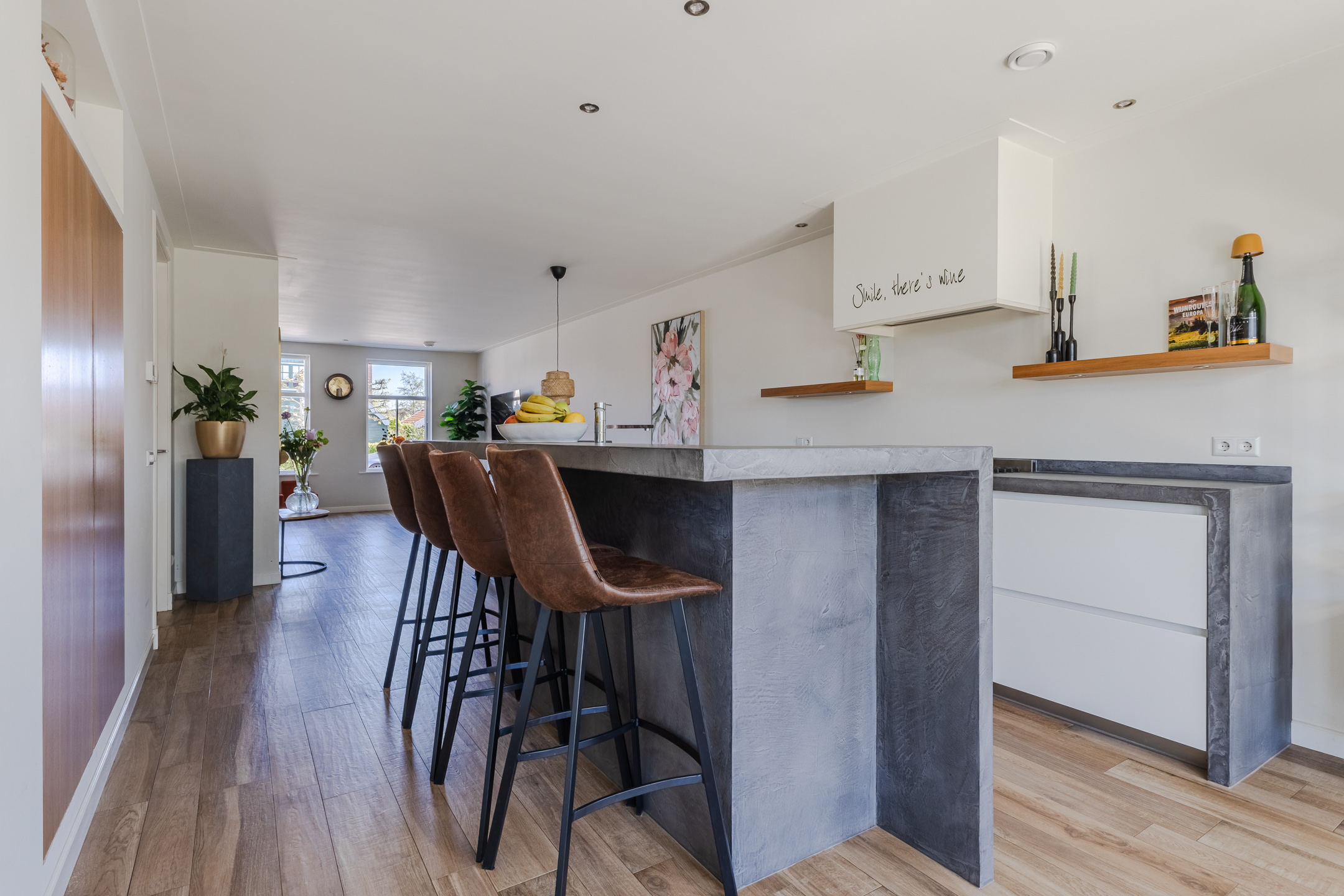 At the back of the living room is the modern, spacious kitchen. The kitchen features a straight kitchen unit and an additional kitchen setup with a bar. The entire space is finished with white cabinet fronts and gray countertops. The kitchen is equipped with a dishwasher, gas stove, range hood and oven. Adjacent to the kitchen is a practical utility room containing the connections for the washer and dryer.