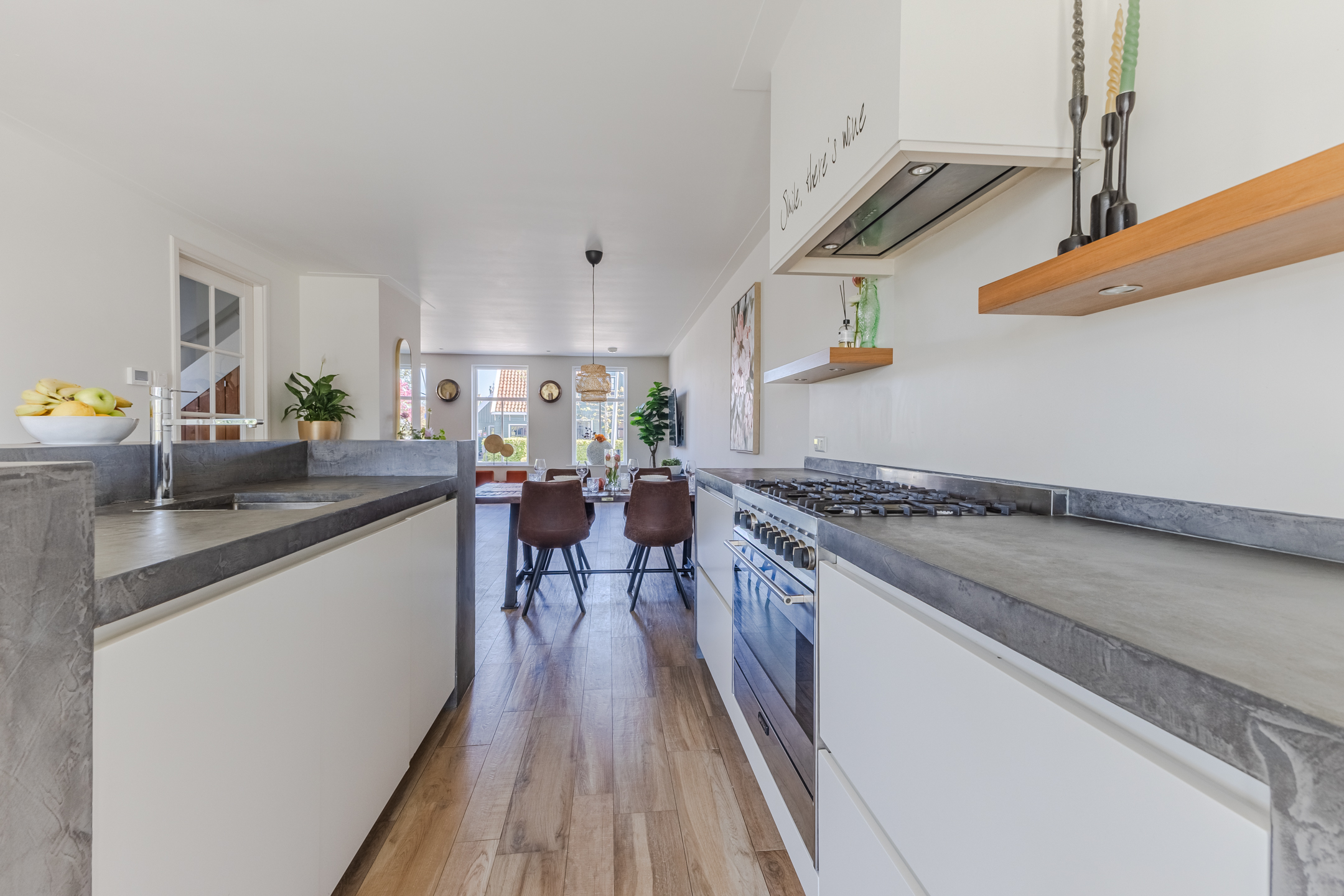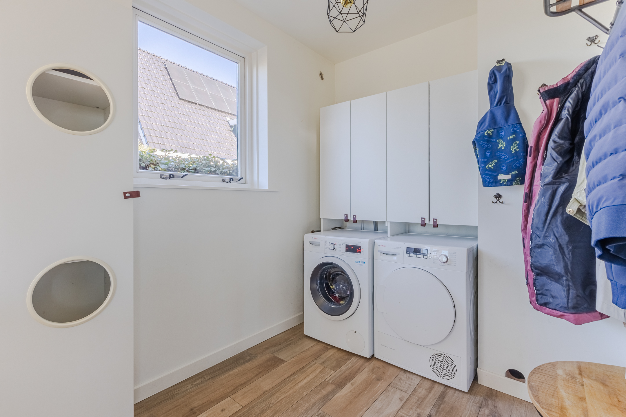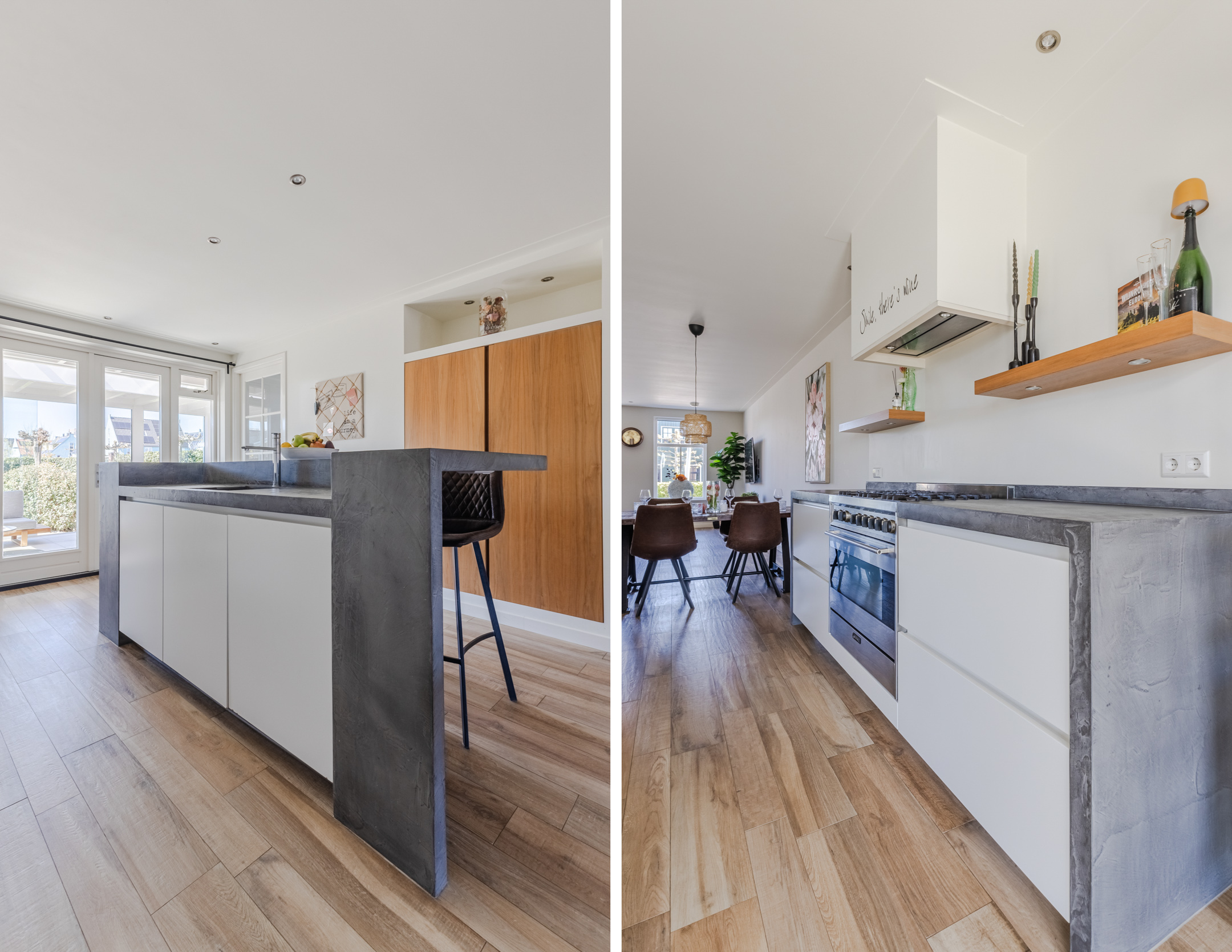At the back of the living room is the modern, spacious kitchen. The kitchen features a straight kitchen unit and an additional kitchen setup with a bar. The entire space is finished with white cabinet fronts and gray countertops. The kitchen is equipped with a dishwasher, gas stove, range hood and oven. Adjacent to the kitchen is a practical utility room containing the connections for the washer and dryer.