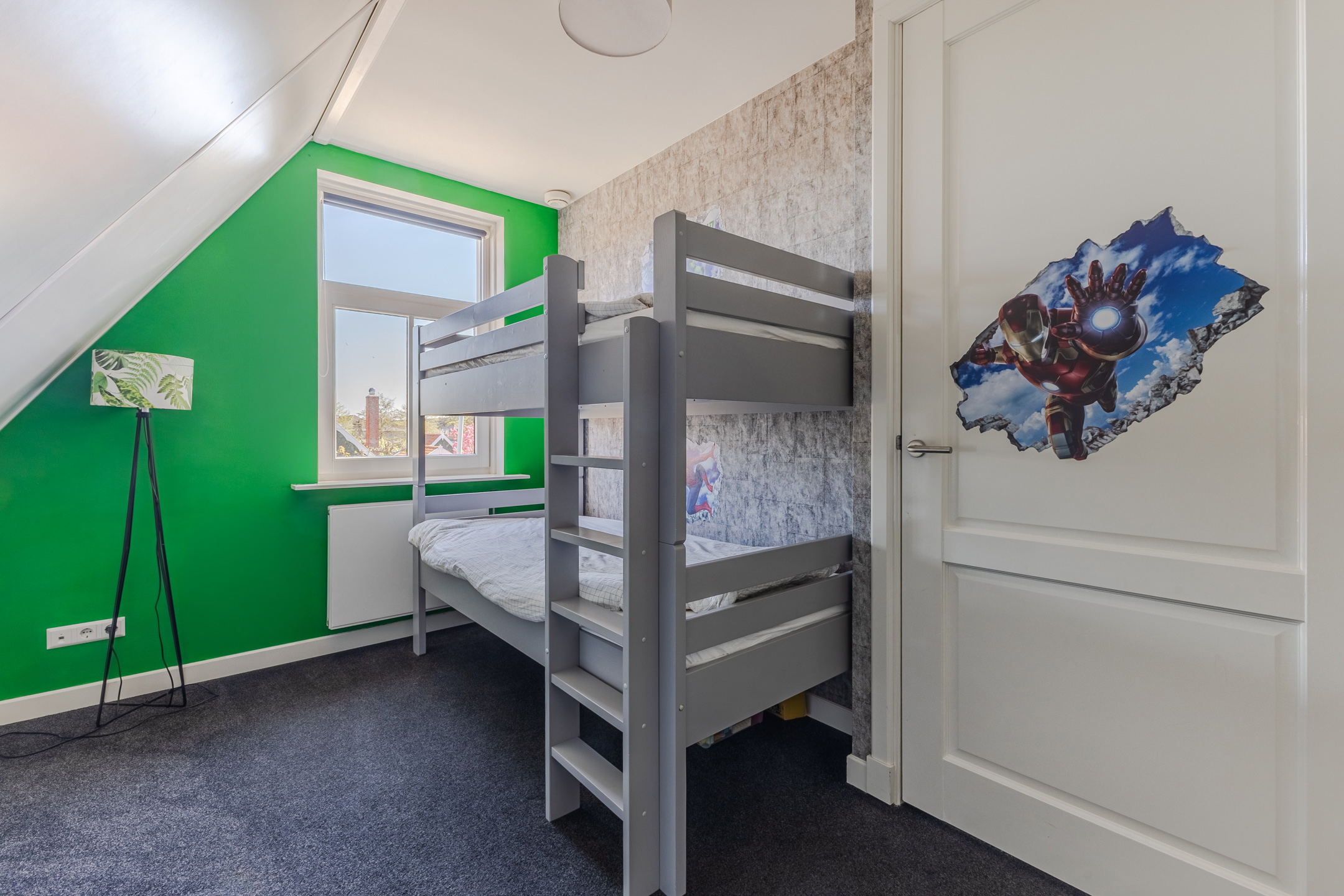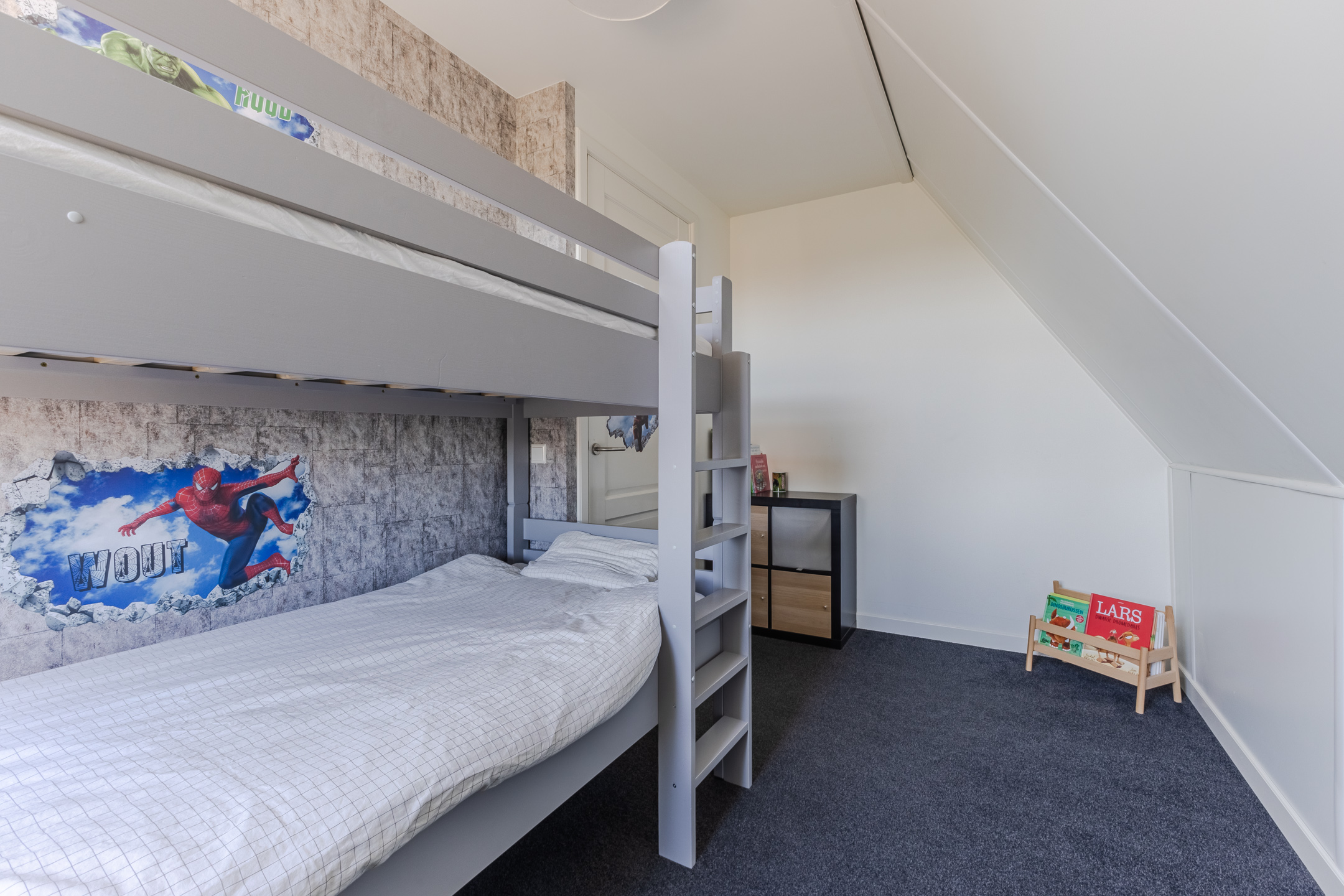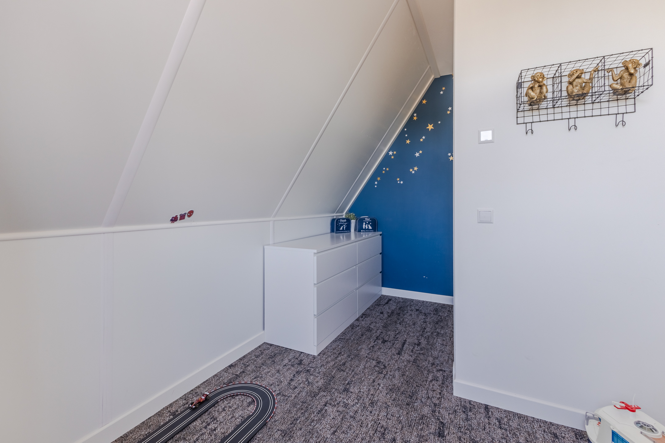 This floor features three bedrooms, a bathroom and a practical storage room. Two bedrooms are located at the front and one at the back. All rooms have carpeted floors and enjoy pleasant natural light.