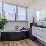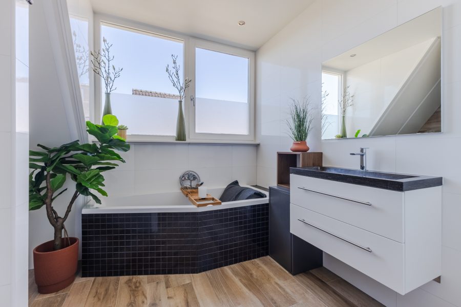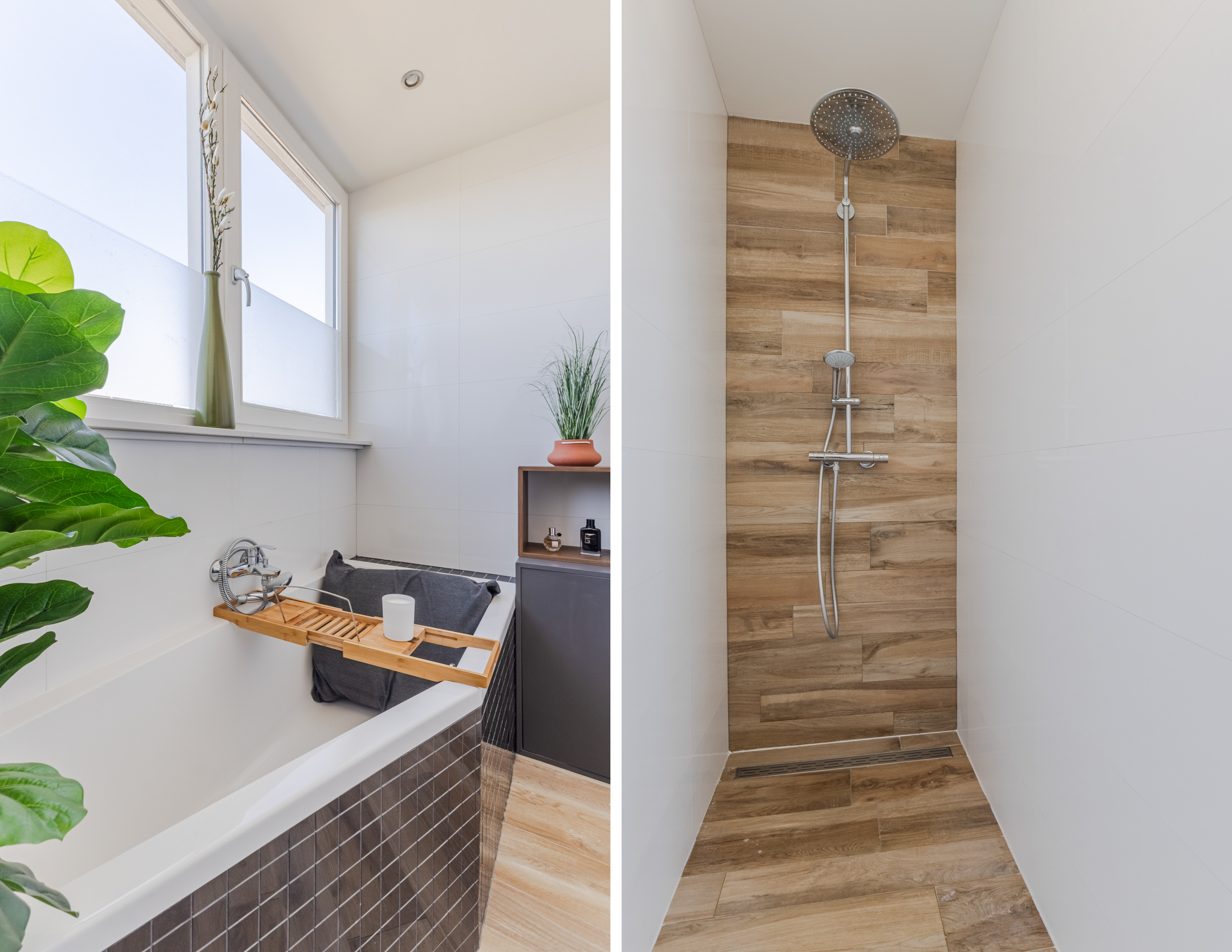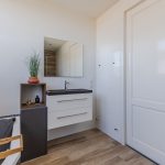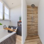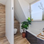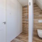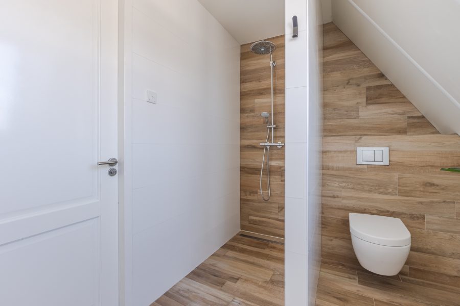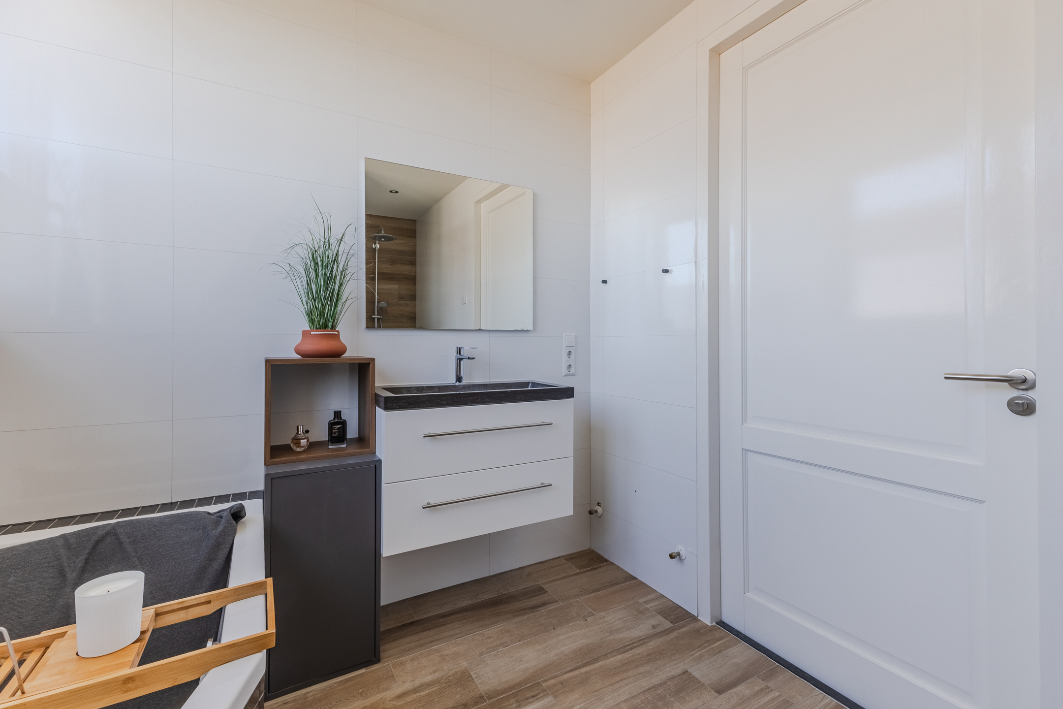 De badkamer heeft een centrale ligging op deze verdieping. Deze ruimte is modern afgewerkt en uitgerust met een zwevend toilet, badmeubel met wastafel, ligbad en inloopdouche met regendouche. Inbouwspots zorgen hier voor de verlichting.