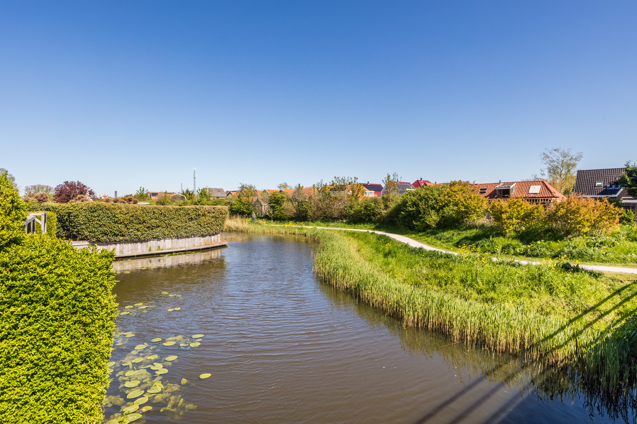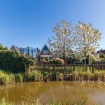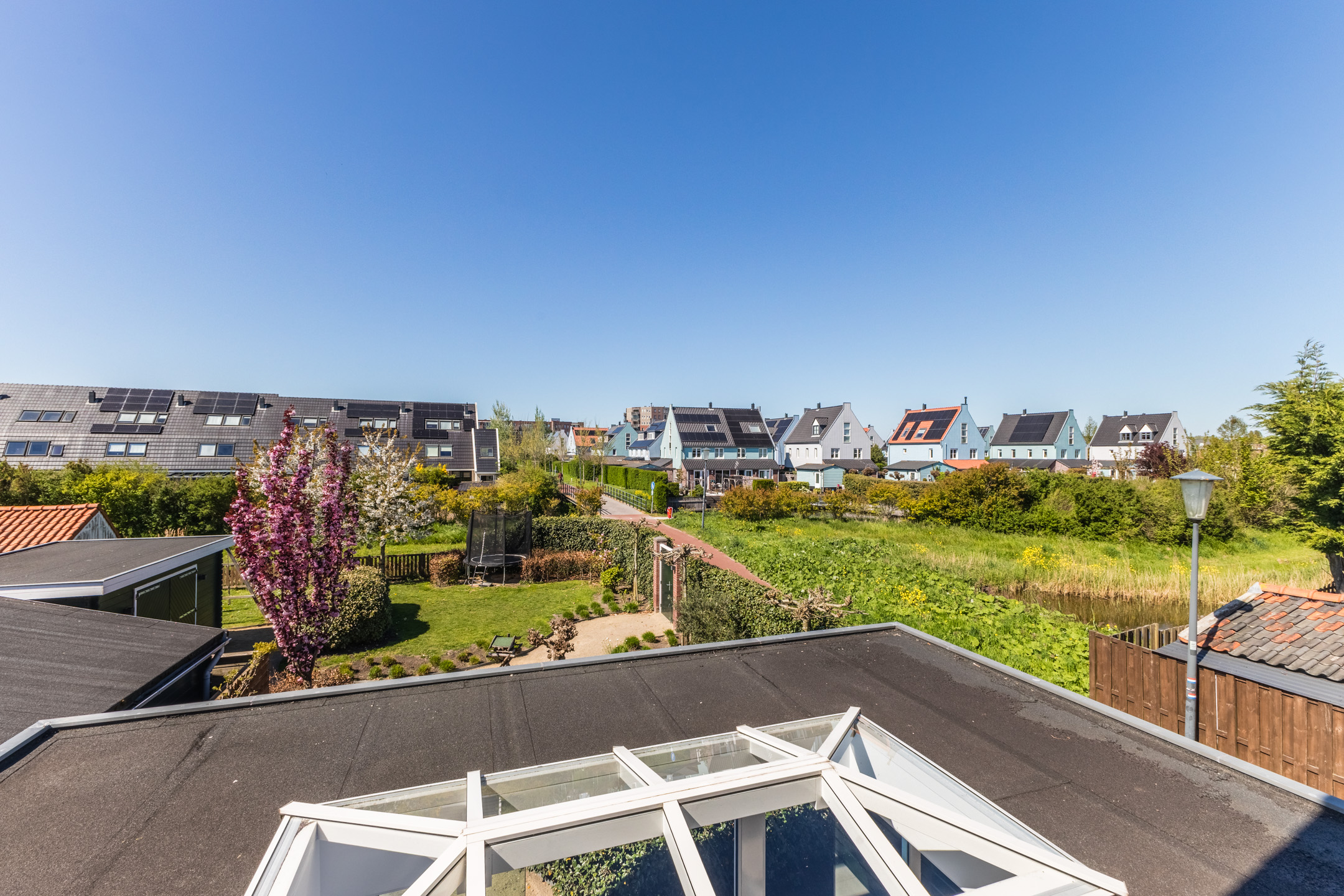 At the back, the garden borders the water. A large, new shed is available for storing garden tools and bicycles. The garden also features a practical side gate.