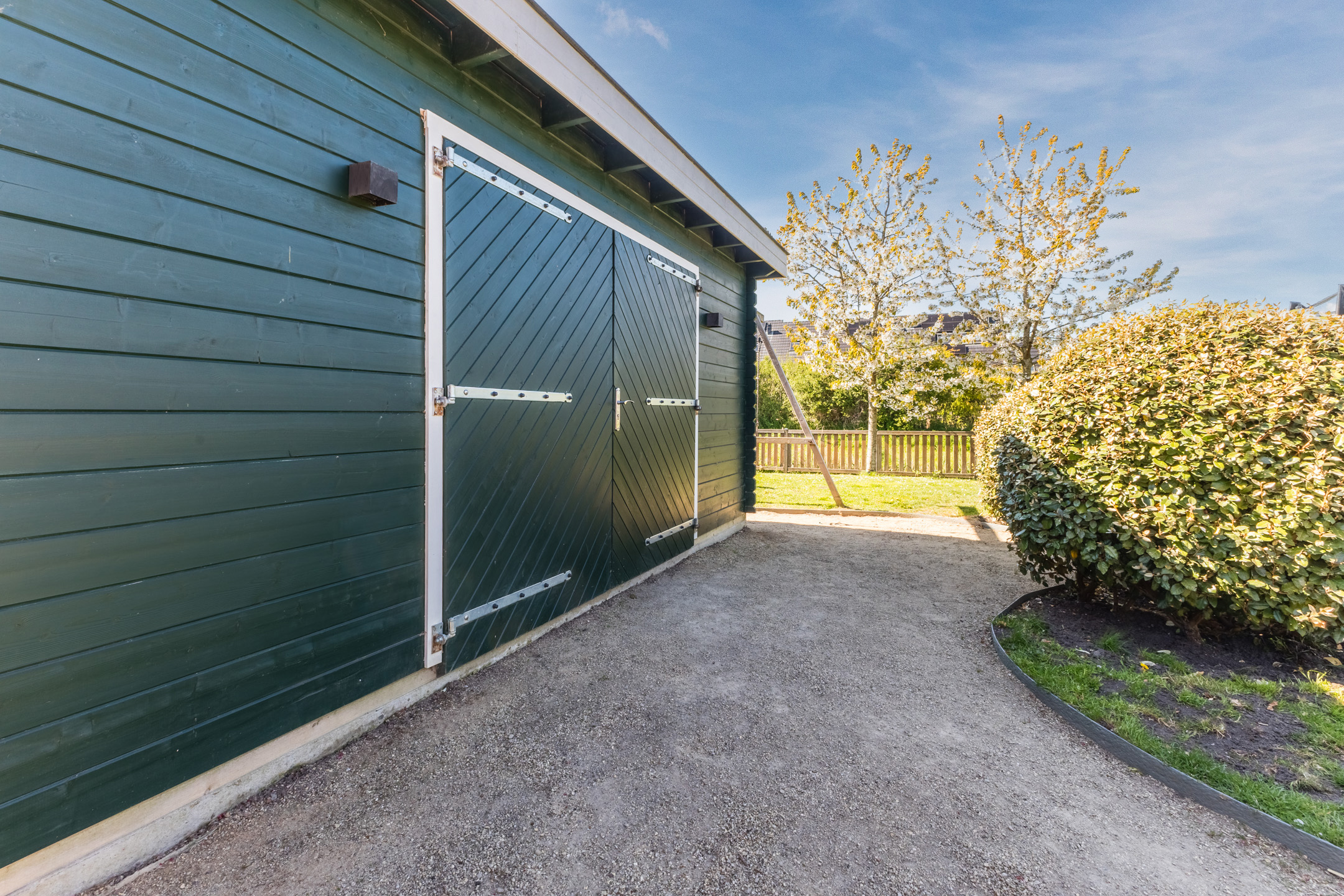 Aan de achterzijde grenst de tuin aan het water. Voor het opbergen van tuinspullen en het stallen van fietsen is er een grote, nieuwe schuur aanwezig. De tuin beschikt daarnaast over een praktische zijpoort. Zowel de schuur als de poort zijn voorzien van funderingspalen.