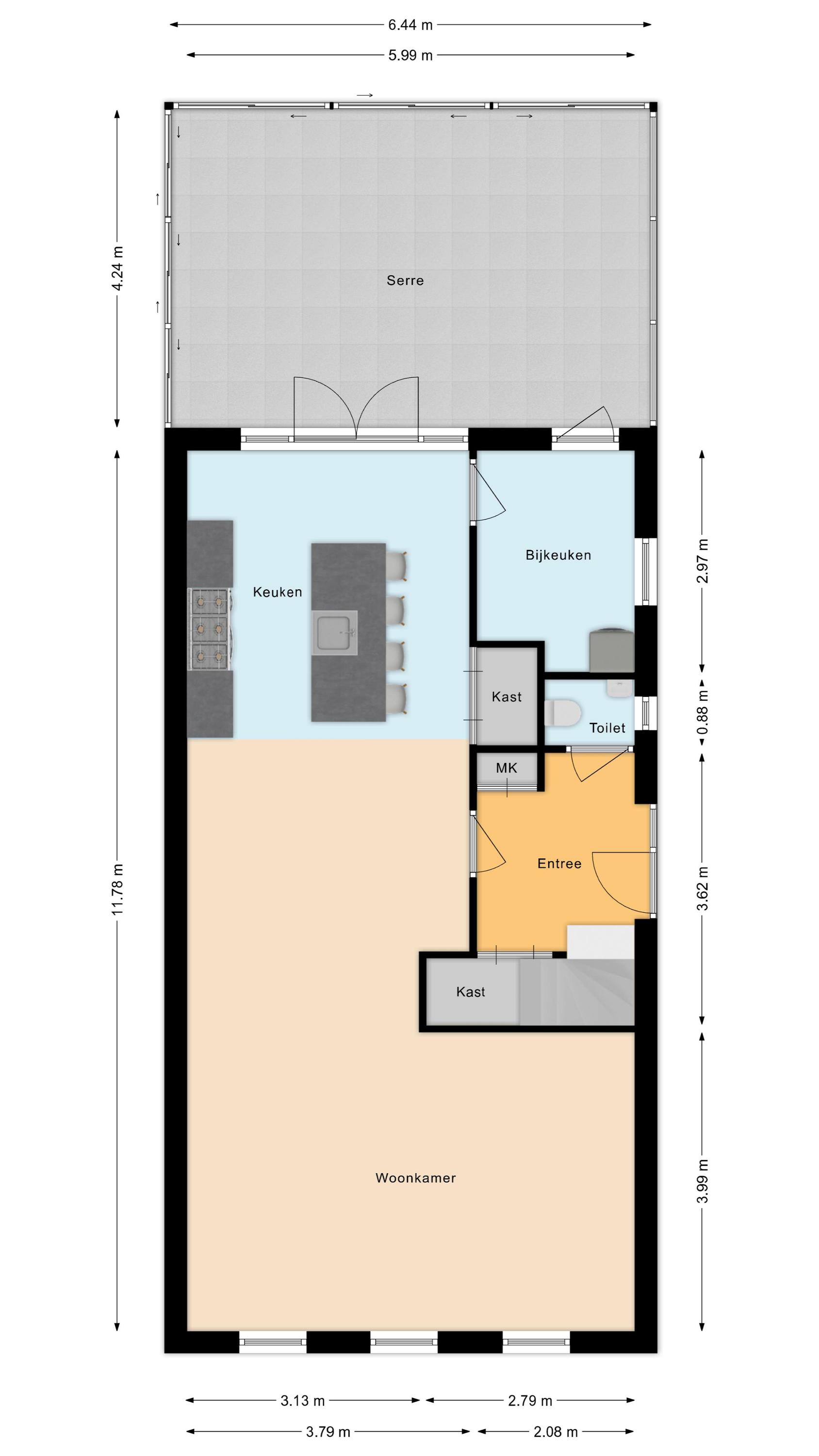 De openslaande deuren aan de achterzijde geven toegang tot de prachtige serre. Deze serre is volledig afsluitbaar met glazen schuifwanden en voorzien van een betonvloer met funderingspalen. De schuifwanden zorgen, in combinatie met de lichtstraat, voor een overvloed aan natuurlijk licht. Er is genoeg ruimte voor het creëren van een comfortabele lounge- en/of eethoek. De serre vormt een mooie verbinding tussen het binnen- en buitenleven.