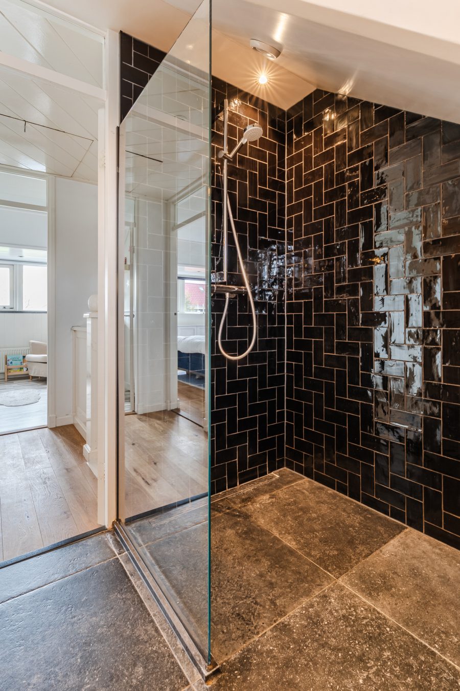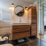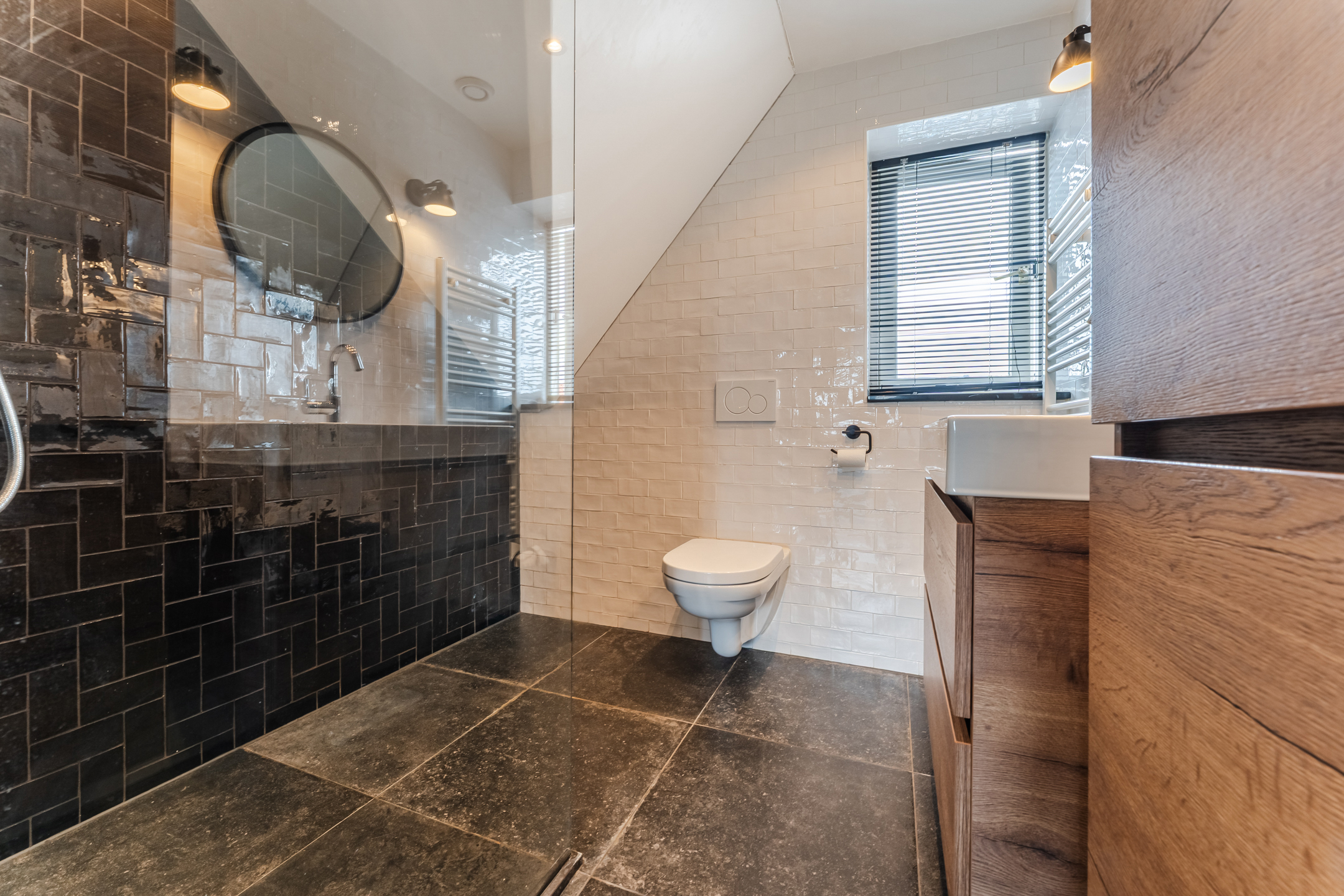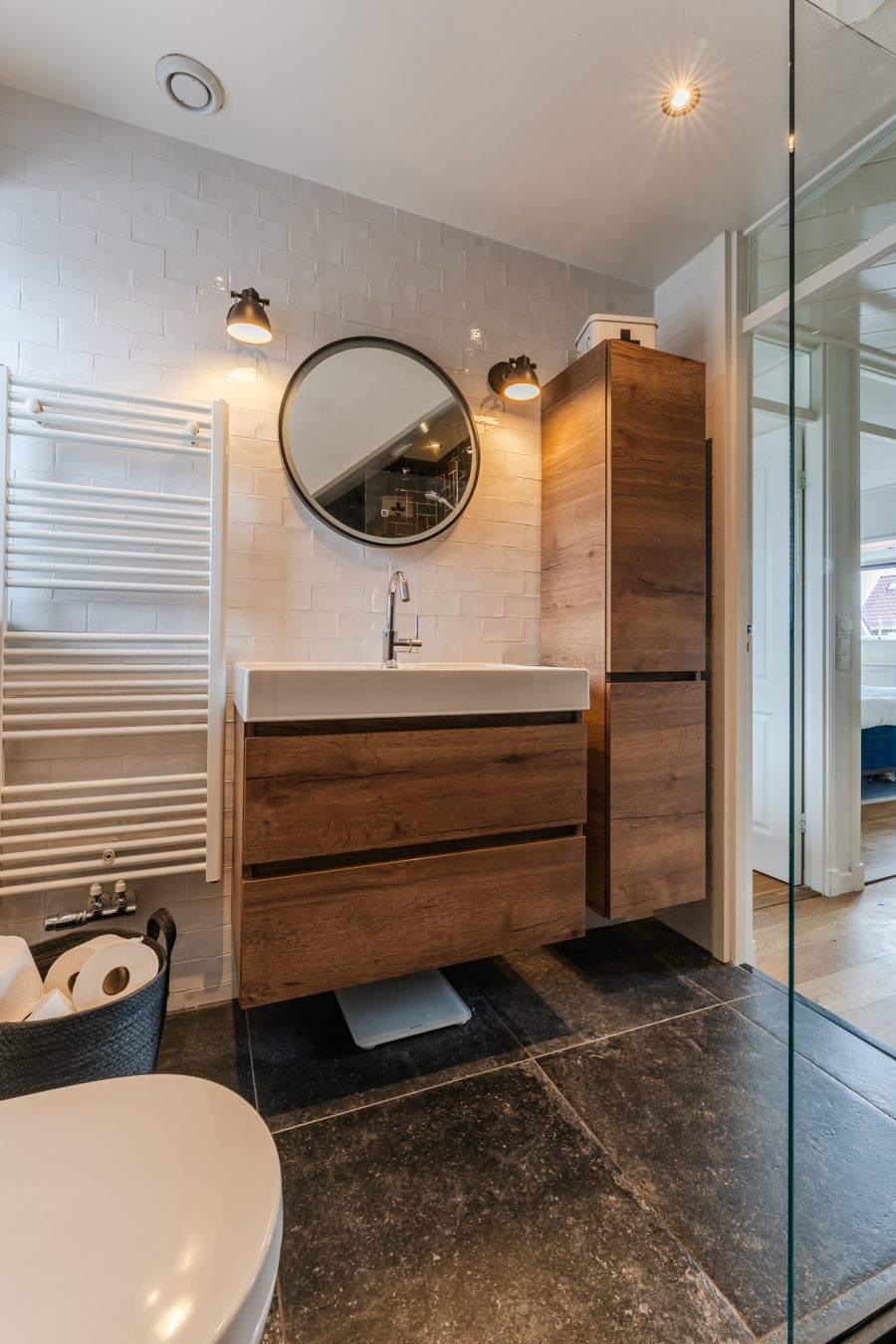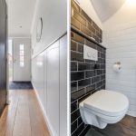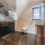 De moderne badkamer, van 6 jaar oud, is een plek om even helemaal tot rust te komen. Deze ruimte heeft een moderne uitstraling en is afgewerkt met een combinatie van lichte en donkere tegels. Je vindt ook hier een zwevend toilet, badmeubel met wastafel, wandkast, designradiator en een inloopdouche; inbouwspots zorgen voor de verlichting.